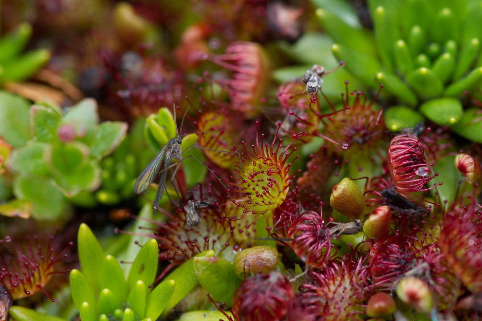 A su alrededor, la murtilla de Magallanes (Empetrum rubrum) pinta el paisaje de rojo intenso durante el verano, mientras que diminutas plantas carnívoras, como la drosera (Drosera uniflora), cazan insectos atrapándolos en su mucílago brillante.
