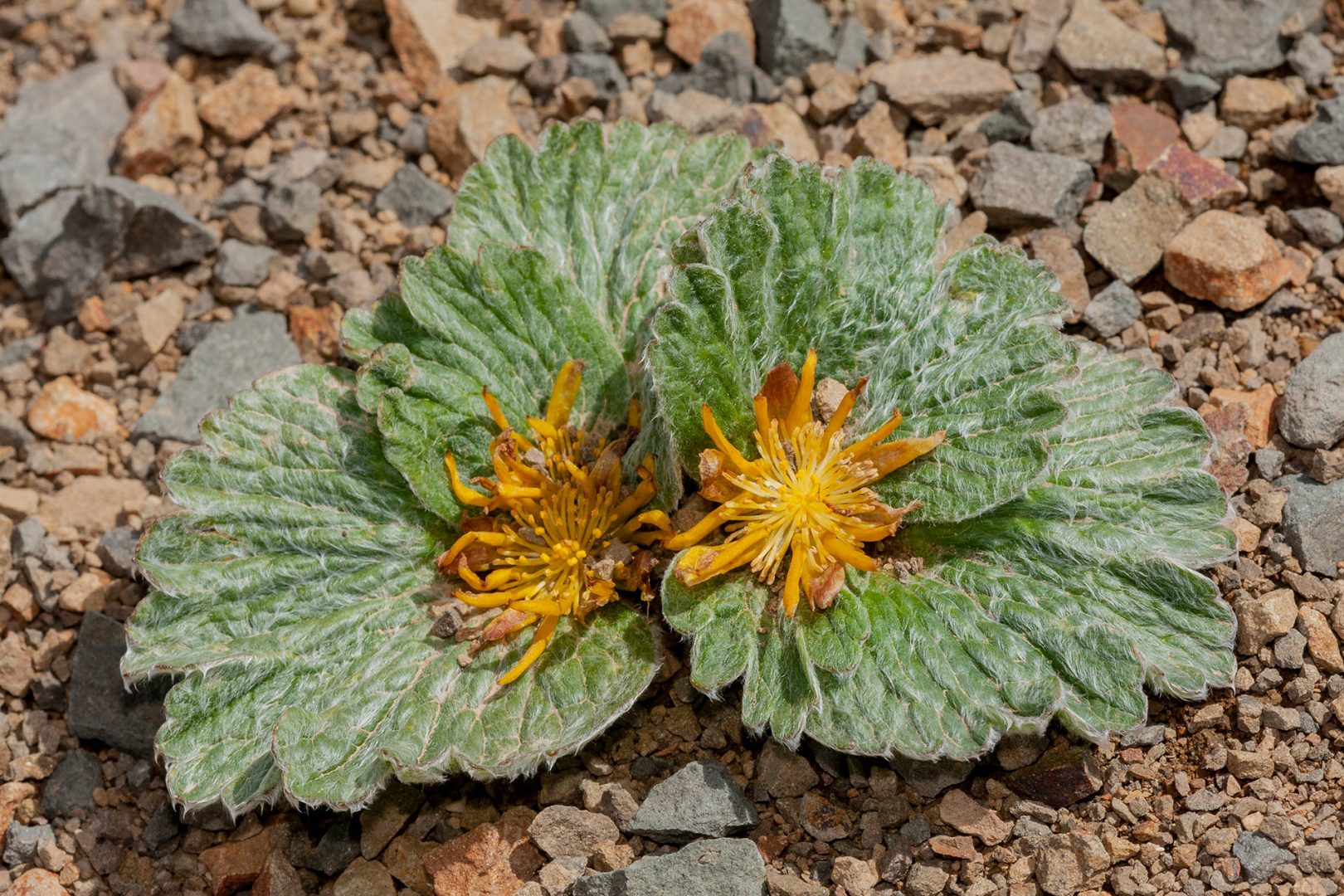 Sobre los 600 metros, los árboles desaparecen y se abre un paisaje de herbazales y pedregales. Aquí la vegetación se dispersa entre rocas y neveros, adaptada a condiciones extremas de radiación solar, viento y sequía edáfica. Entre las especies más notables destacan la flor de chocolate (Nassauvia magellanica), la llaretilla (Azorella monantha), la violeta de tres dientes (Viola tridentata) y la hamadryas (Hamadryas kingii), cuyas hojas plateadas reflejan la luz. Cada una de ellas ha desarrollado estrategias únicas: formas en cojín para conservar calor, hojas coriáceas que evitan la deshidratación o raíces profundas que buscan la humedad bajo la roca.