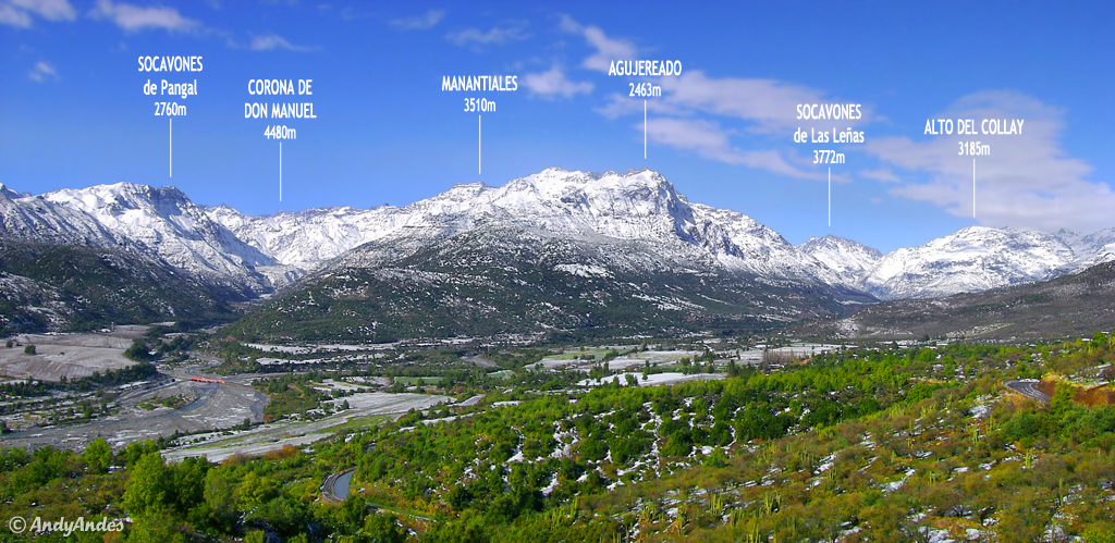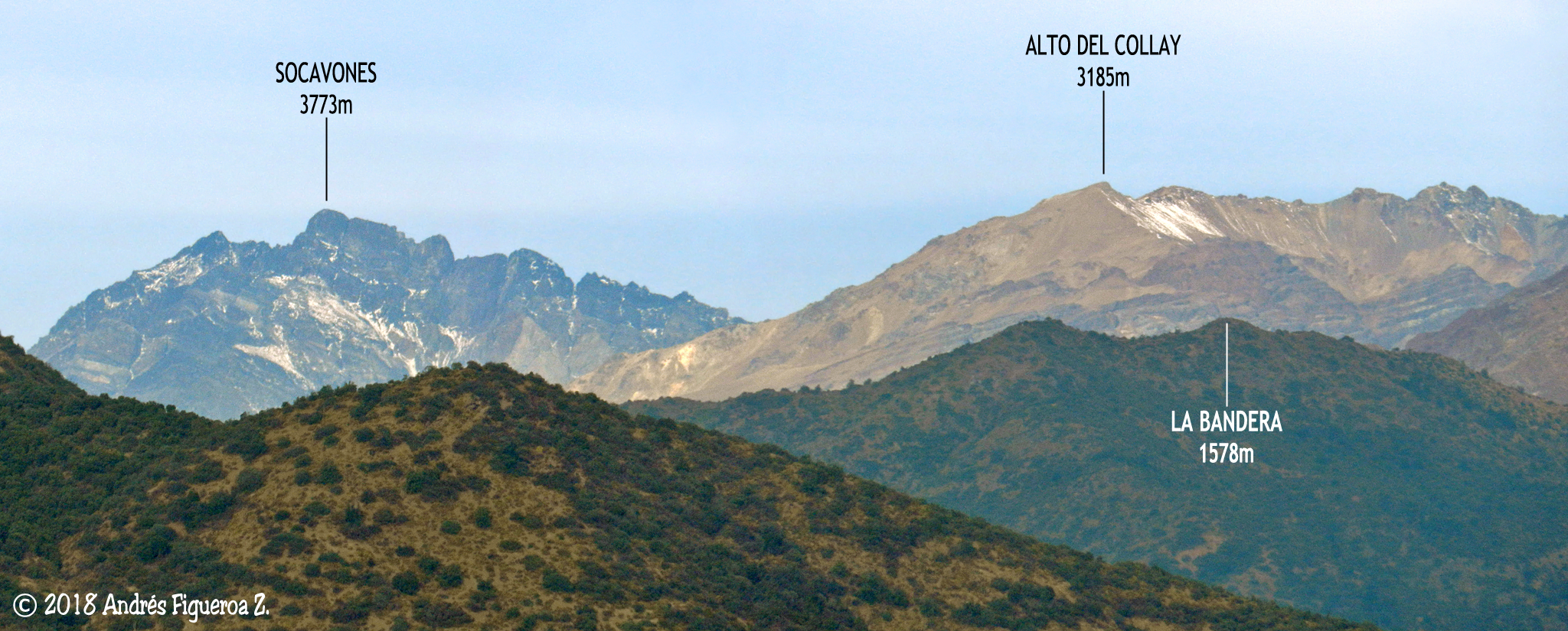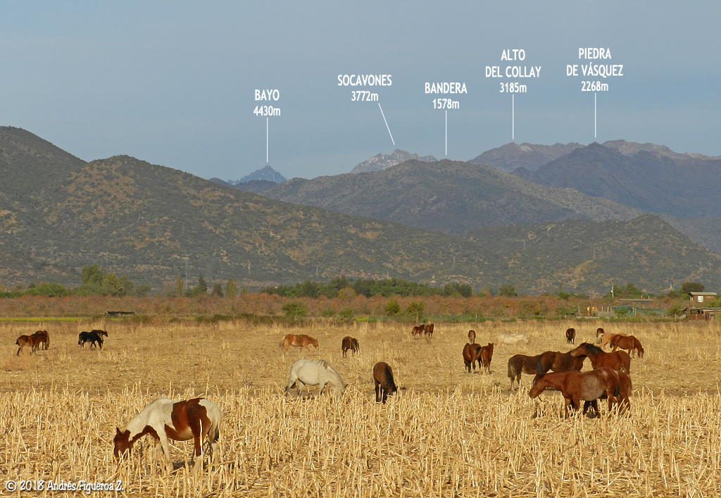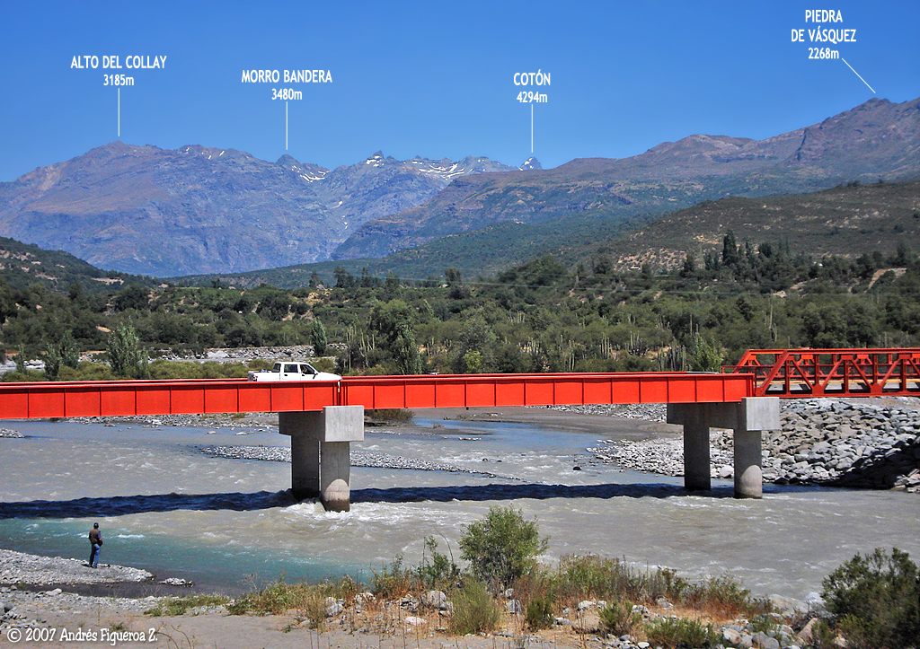 Cara noroccidental del cerro Alto del Collay en la desembocadura del río de Los Cipreses en el río Cachapoal. Foto captada desde el sector Ranchillo de la Reserva Nacional Río de Los Cipreses, el 2 de febrero de 2009.