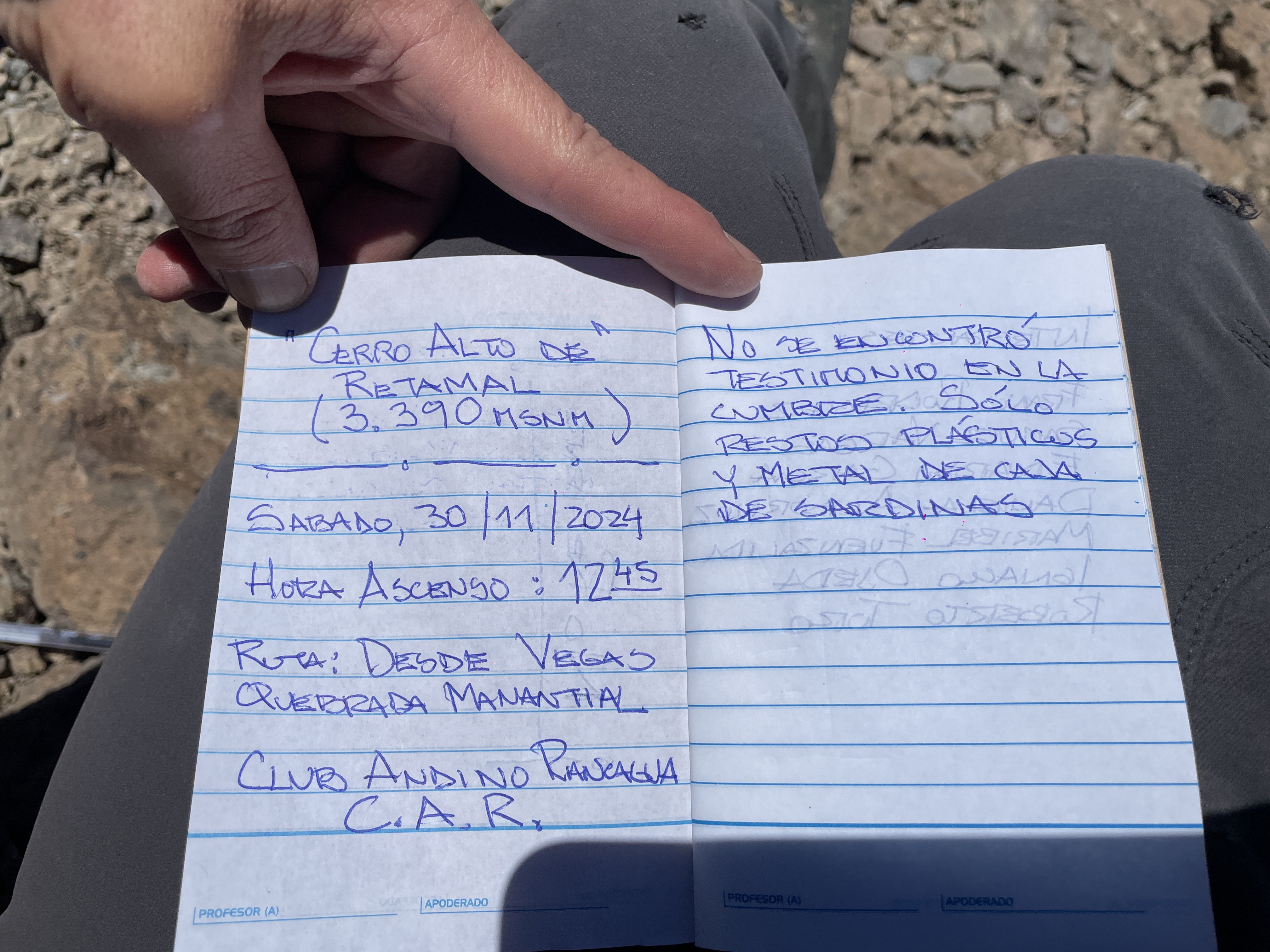 Dejamos una caja de cumbre con libreta y lápiz. No se encontró testimonio en su cumbre