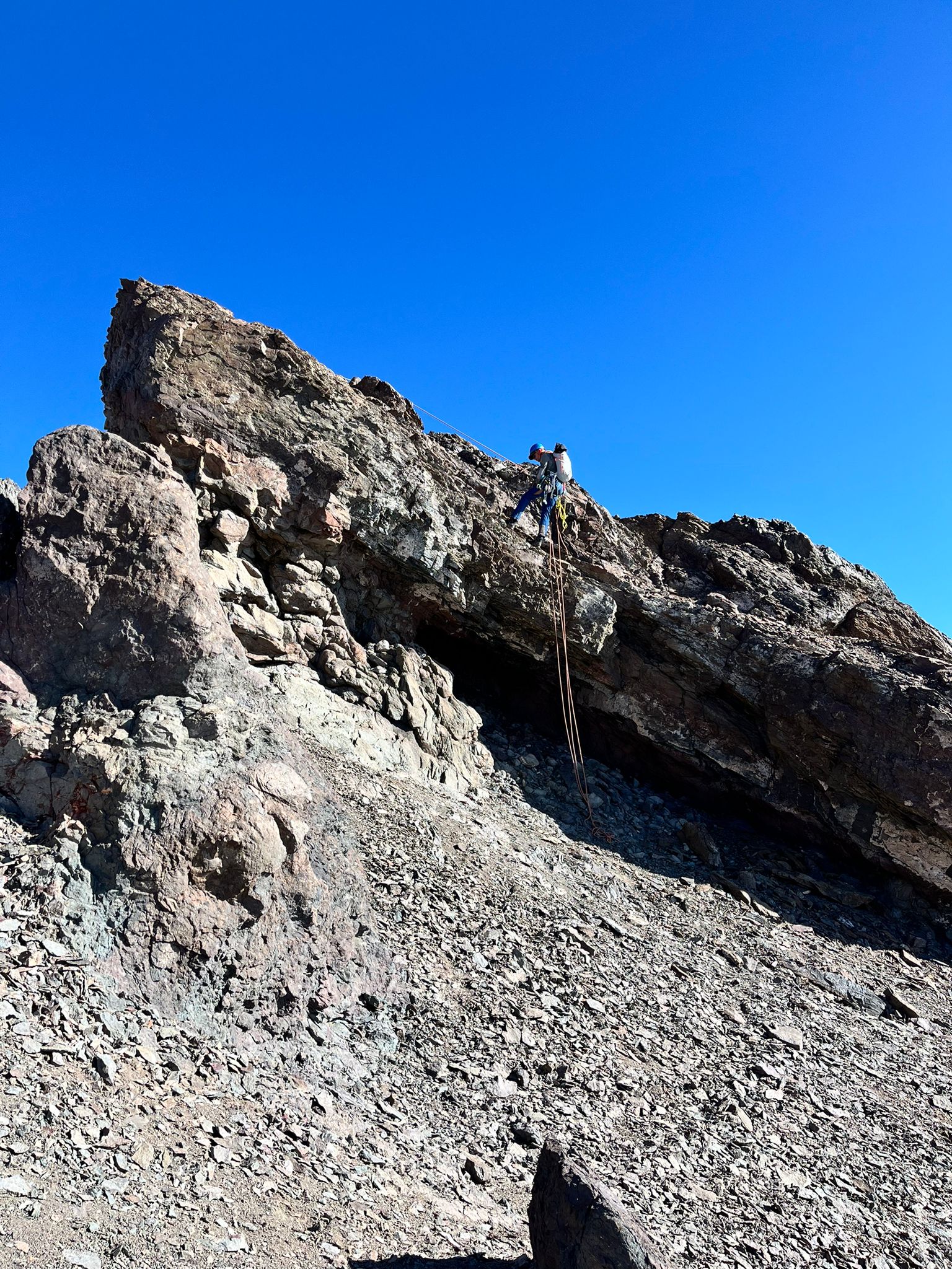 Hay que pedir un permiso para ir desde Valle Nevado, por correo al valle Nevado directamente. No dejan pasar con auto o caminando sin permiso. Nosotros no lo habíamos hecho y finalmente el guarda de buena onda, hizo una llamada y nos dejó pasar después que nos inscribimos en una ficha. Partimos caminando desde el hotel hasta Tranque Tres Puntas (Unión) donde acampamos. Ojalá se puede subir en auto para ahorrar 2h30 de subida con la mochila pesada. Finalmente, no fuimos hasta Piedra Numerada como planificado porque llegamos muy tarde el viernes. Sábado partimos a las 7 de la mañana, con mochila chica y con todo el equipo para los rapeles y con herramientas extra porque teníamos algunas dudas de la complejidad de los tramos técnicos. La subida se hace bien, la altura se siente al final. Llegamos a la parte más inclinada antes del primer rapel, precioso pero impresionante con el vacío del otro lado de la montaña. Llegamos al primer rapel y nos quedaba como 500 m aprox en línea recta hasta la cumbre, pensábamos demorar 2h máximo, pero nos demoramos mucho más. Fuimos con calma, y también creo que nos equivocamos un momento de camino. No es tan obvio, igual con el tack en el GPS. Los rapeles son entre 10 y 20 m hasta la cumbre. Hay siempre varios cordines y cuerda en los puntos estratégicos para bajar los rapeles. De manera general, hay varios cordines y evaluamos suficiente seguro para bajar con los varios cordines instalados. Cuidado hay 4 falsas cumbres, importante tener lo claro para su salud mental jaja. En los tramos un poco más expuestos, elegimos progresar encordado, pero no es difícil. Llevar harta agua, el sol pega fuerte, la progresión es lenta y intensa.