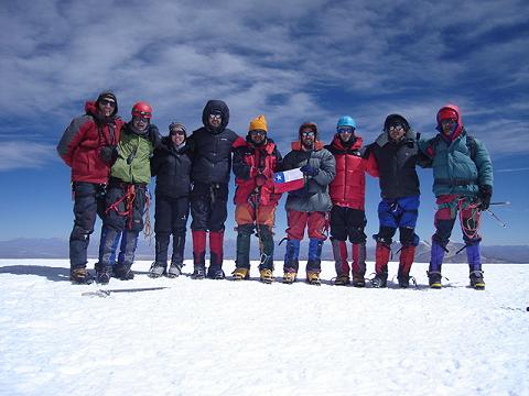 De Izq a der. Atalah, Muñoz, Delgado, Carrasco, Tejeda, Cross-Buchanann, Ferrer, Salvador y Del Río Dos noches en el CB (4.810 m y con agua corriente), una noche en el CA (5.680 m) y desde ahí, entre 9 y 10 h a la cumbre. Aprox una hora del CA hay que superar un canalón bastante expuesto que aseguramos con cuerda de 60 m. Superado el canalón, comienza la cúpula glaciada del cerro, cuya mitad inferior estaba cubierta de penitentes de hasta metro y medio de altura. El resto de la ruta transcurrió por nieve dura cruzada por algunas grietas evidentes que sorteamos sin encordarnos. Sólo después de 5 engañosas antecumbres se accede a la cima.