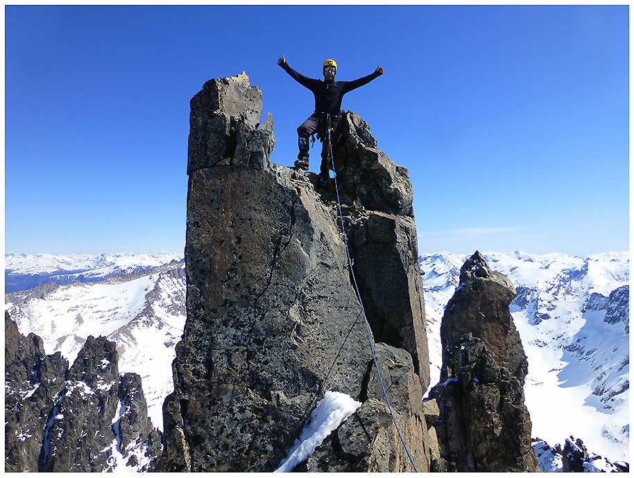Lindo pegue!! Ascendimos principalmente por la cara Este, más tarde escalamos un canalón en la cara norte, hombro Este y el largo de la torre final que abordamos por el sur. Bella y variada ruta. Potente y gratificante montaña.