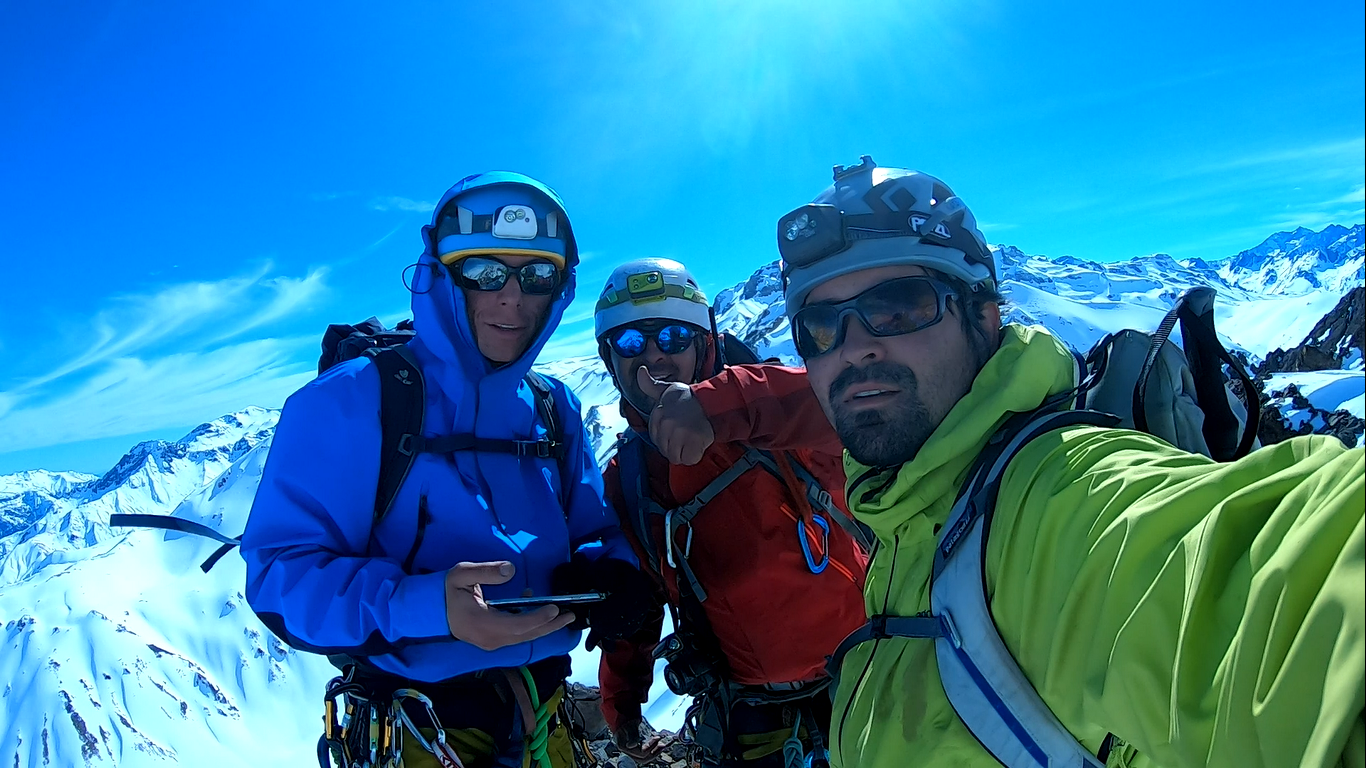 Joaquin Tobar, Pedro Hevia y Sebastian Pavez. excelente cerro, iniciamos el ascenso 5 personas a las 4am y a medida que ascendimos surgieron complicaciones de una antigua lesión en uno de los compañeros y su hermano decidió acompañarlo en el descenso ya que era peligroso que descendiera solo, continuamos tres hasta llegar a la cumbre a las 12pm