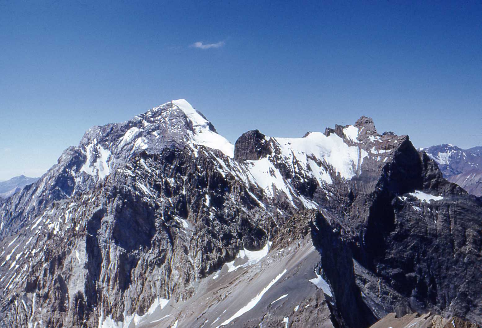 Vista hacia el Chimbote y el Polleras Parto a las 7:00 del campamento alto y subo por el filo Noroeste del cerro por acarreos, en parte, muy empinados. A la 1:00 alcanzo la cumbre, al principio creo estar en el Catedral, pero veo que éste se encuentra mucho más al Sur y hay un profundo portezuelo entre medio. En la carta Fickenscher-Klatt hay un cerro de 5183 m entre el Chimbote y el Catedral que debe ser éste. Dejo en un hito de piedras un testimonio con el nuevo nombre de cerro Toscas, puesto que el cerro domina este valle. Tras un largo descanso en la cumbre, desciendo aproximadamente por la misma ruta al campamento. Desarmamos este mismo y más tarde nos encontramos, en el punto acordado, con el arriero con sus animales que nos lleva hasta el campamento base.