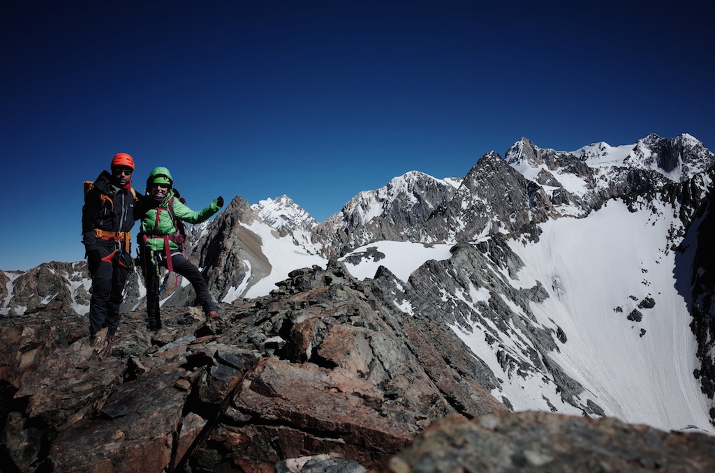 Día excelente para subir. Mañana fria, sin viento, despejado. El diedro tenía nieve y hielo en sus primeros metros. El glaciar con grietas cubiertas y penitentes en formación. Salimos aprox 4:15am desde un vivac en la morrena y a las 9am estábamos en la cumbre.