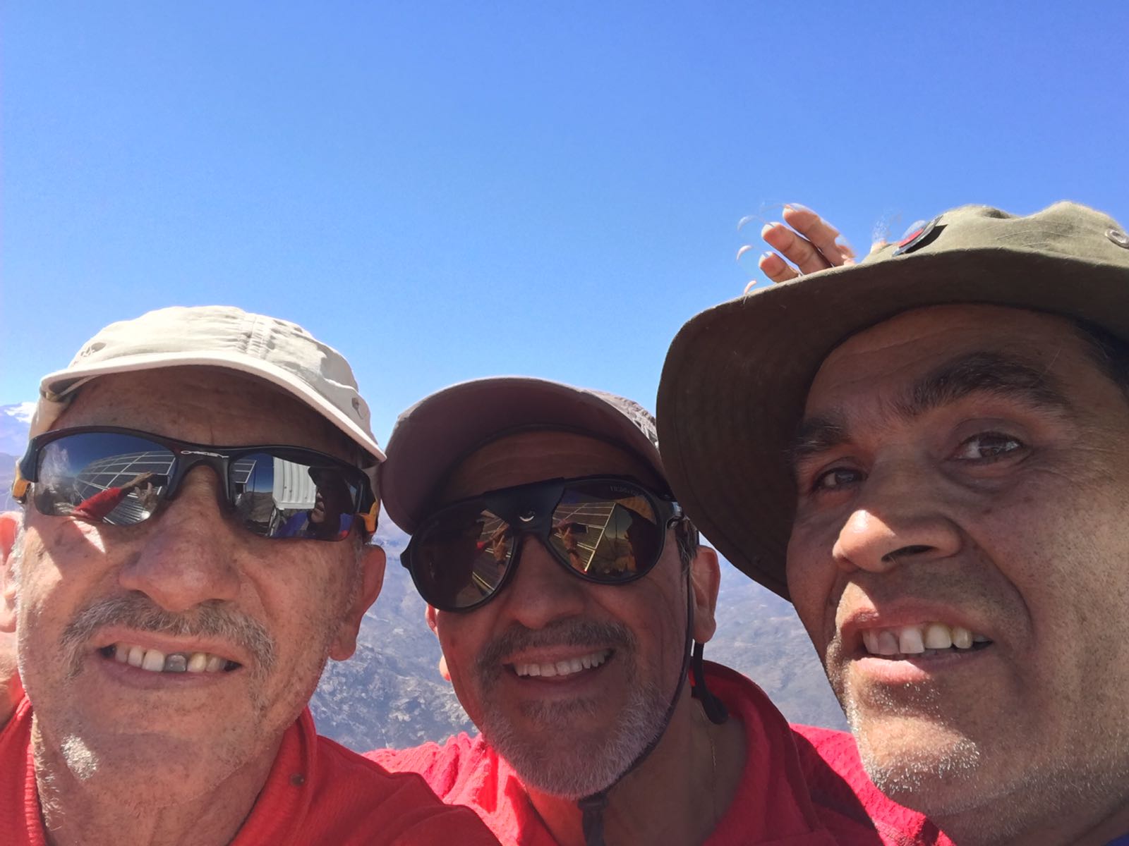 En el reflejo de los lentes se ven los paneles solares y antenas existentes en la cima. Subimos por la pasada de rocas y, de común acuerdo, por seguridad, bajamos por el acarreo de la ladera sur.