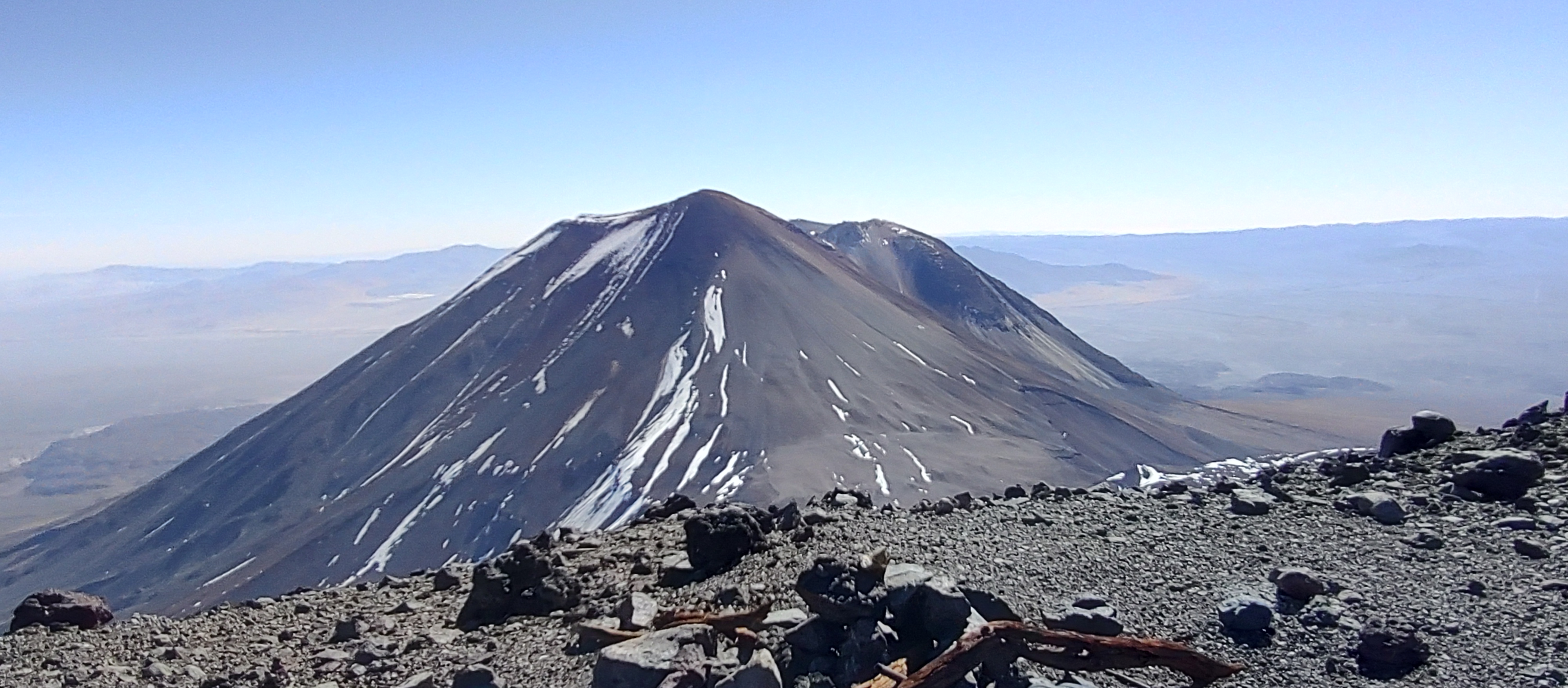 Volcán con hermosa vista, la ruta es larga, no técnica pero un poco dura por el sol y el tiempo y clima del lugar, recomendable hacer en dos jornadas, se puede establecer un CB en en portezuelo a las 5.000 msnm.