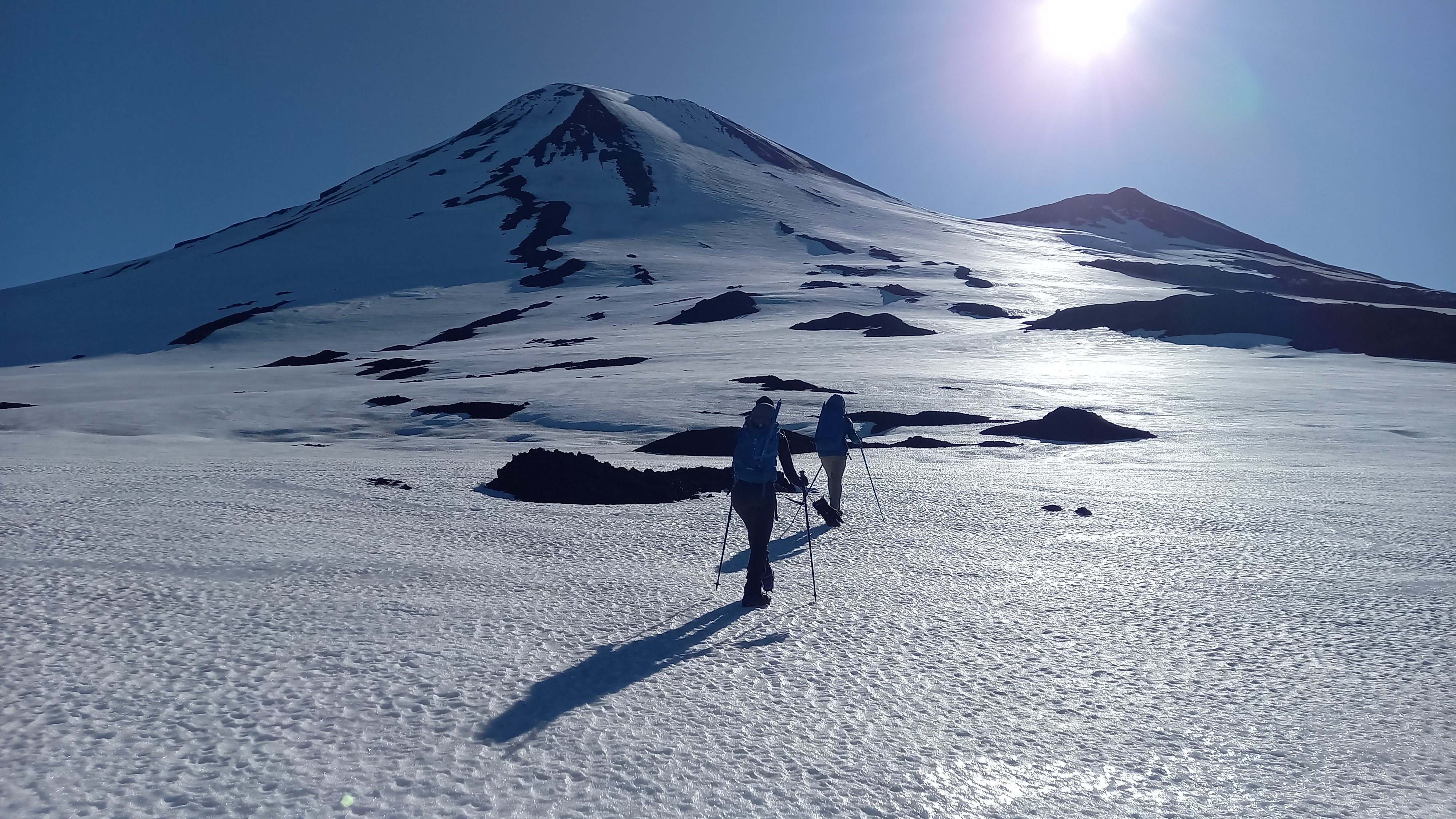 Fuimos con el gran guía Pipe de Melipeuco, un día de diciembre 100% despejado pero con viento muy fuerte en la cumbre (sobre 80km/h, no pudimos permanecer mucho). Subimos por la cara oeste, nieve dura, pendiente de 35 hasta 40° durante 700m que nos demorramos aprox 2h en subir, muy pero muy bonito. La nieve empezó a soltar a la vuelta, lo que simplifico la bajada.