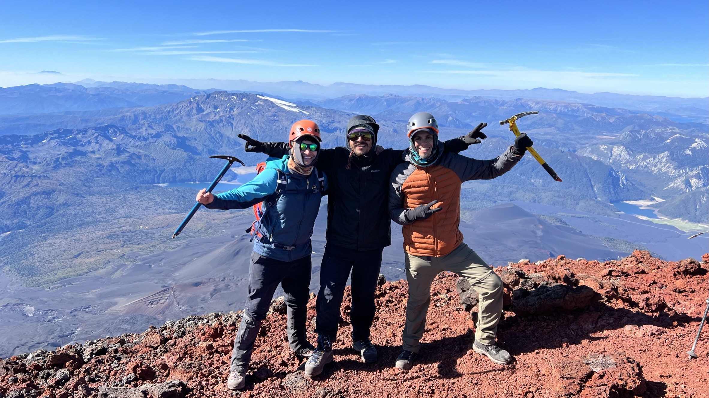 Comenzamos desde el centro de ski a las 4:30 am. Ascenso hasta el plateau sin nieve, casi llegando a este punto aparece la primera plancha de nieve muy dura, lo que obliga al uso de crampones que usamos hasta la cumbre. Nieve dura en el plateau que permitió el avance rápido hasta el cono, desde acá seguimos a menor ritmo por el desnivel pero constante y con buen agarre. En el comienzo de zona de fumarolas se apreciaron múltiples deshielos generando cuevas poco profundas que se pueden sortean con cuidado por puentes de nieve. Tras este punto y a 300 metros de la cumbre comienzan planchones de nieve y acarreos. La mayoría de los acarreos resultaron de muy difícil ascenso, recomendamos subir en la medida de lo posible por los planchones de nieve, muy cerca de la cumbre no queda opción más que avanzar por acarreos, fijarse bien porque hay pequeñas marcas de senderos zigzagueantes que alivian bastante el ascenso. Tras 6:30 hrs logramos hacer cumbre, día completo despejado y ascenso prácticamente sin viento( leve en la cumbre). Ese día logró cumbre otro montañista en solitario. Otra cordada de 2 que venía a muy buen ritmo llegó hasta la zona de cuevas, si bien no apreciamos lo que sucedió, suponemos que tuvieron alguna dificultad en este sector y luego descendieron sin problemas, recomendamos en la medida que indique si criterio algún sistema de anclaje como estaca de nieve y quizás alguna cuerda o cordin para salir de las cuevas sin dificultad. El descenso por los acarreos fue muy amigable, la nieve más blanda pero sin dificultad. Dejamos el contacto del único camping que encontramos con disponibilidad en esta en fecha en Cherquenco: +56992139807 Doña Irene y Don Cesar, muy amables y el camping muy lindo.