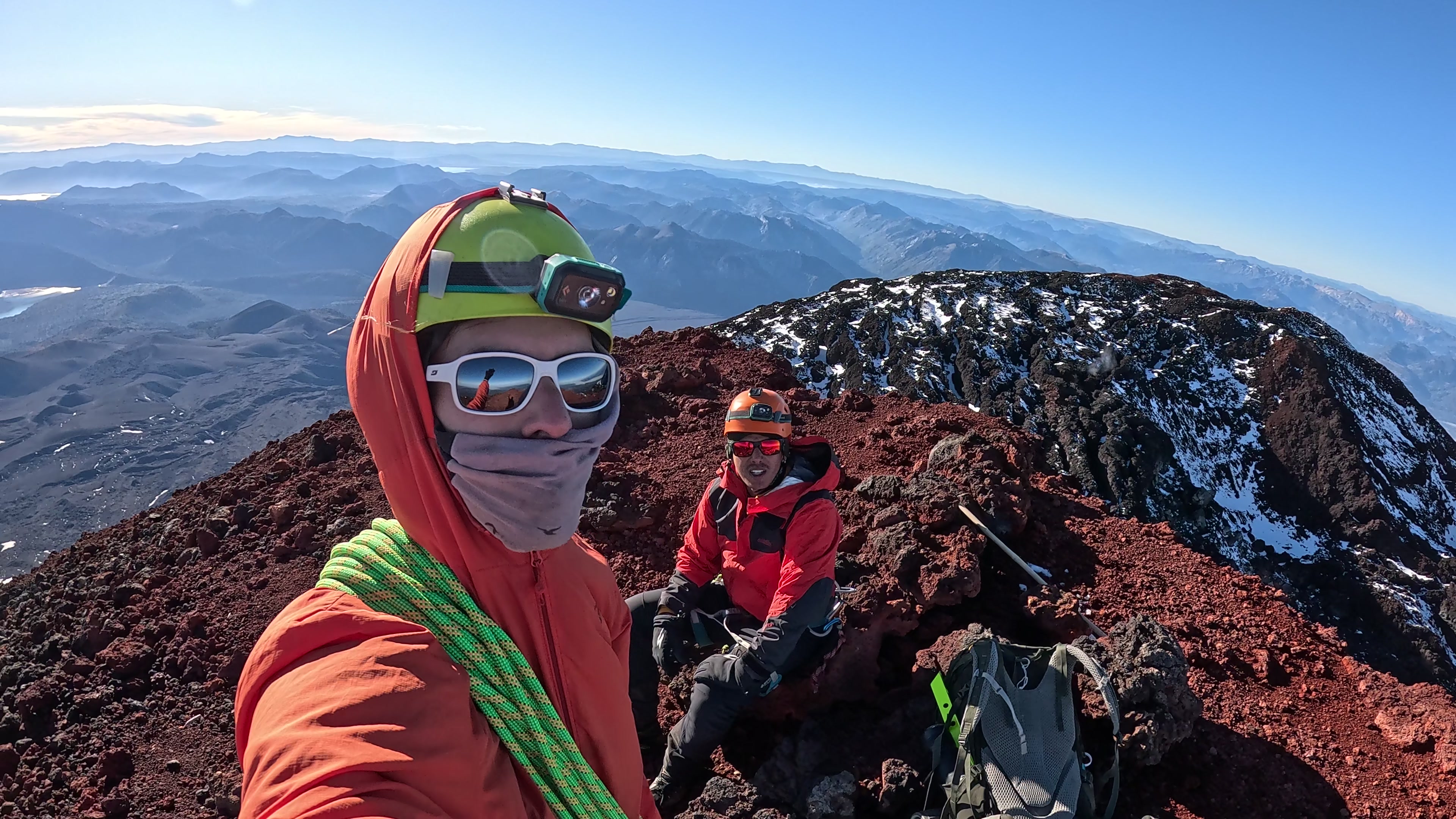 Julián Yañez y Nicolás Tomassi en cumbre de Volcán Llaima. Queríamos hacer la ruta Los Paraguas, a los 2500msnm nos vimos encerrados entre grietas por lo cual optamos por cambiar vía e intentar una canaleta en la cara Sur-Oeste. Salimos del glaciar para iniciar el ascenso por esta canaleta a la izquierda del glaciar, la canaleta contaba con nieve-hielo en la misma, subimos por la misma por 600mts de desnivel hasta la cumbre, la misma cuenta con una pendiente considerable, alrededor de 45°. El descenso lo hicimos por la misma canaleta apuntando al plateu.