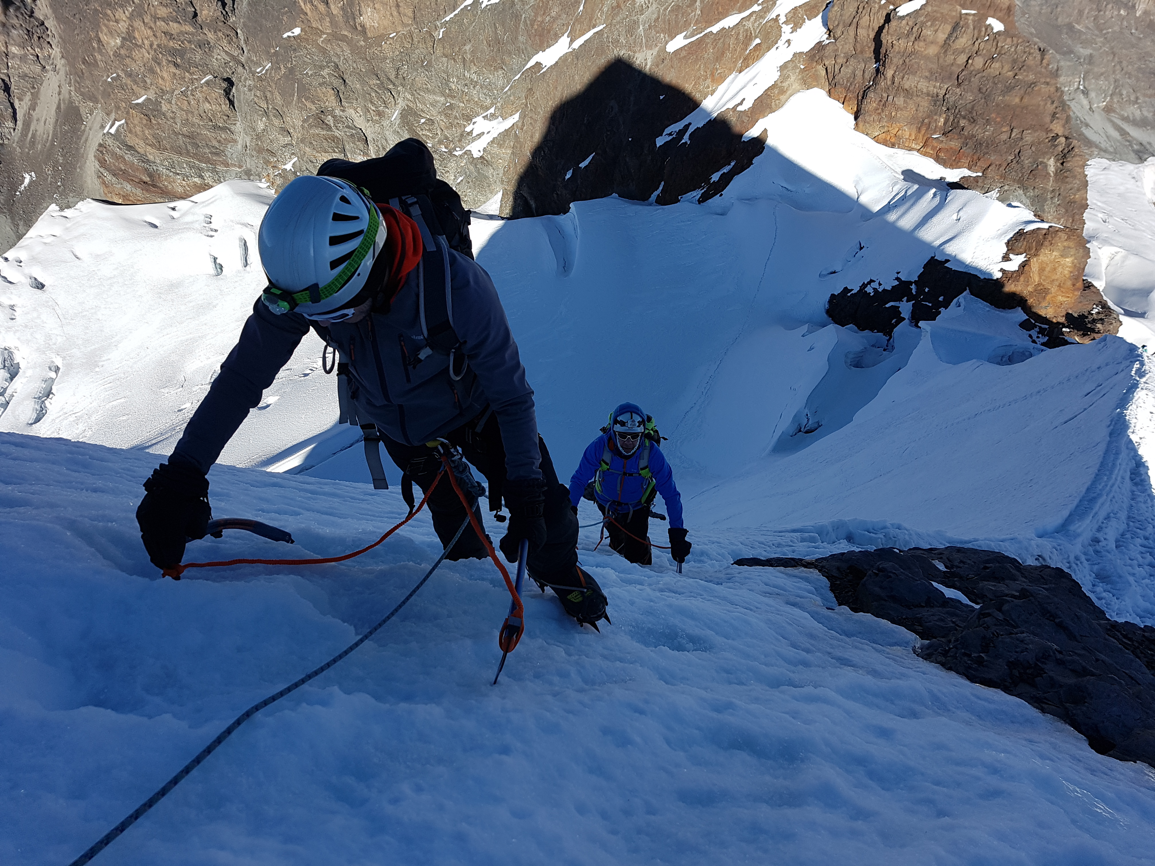 Escalando a la sombra del pico, proyectada al amanecer. Fabulosa ascensión en familia, guiada por los míticos hermanos Mamani (Eduardo y Gregorio), de @bolivianmountainguides.com