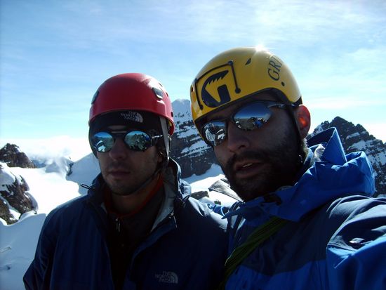 Izquierda: Miguel Pezo, Derecha: Marco Poblete. Primera cumbre en la Cordillera Real boliviana. Nuestros esfuerzos comenzaban a dar sus primeros frutos. Traveseamos desde la base del Tarija para alcanzar el Portezuelo. En el ultimo tramo una linda rampla de nieve/hielo bien expuesta nos dejaba en la cumbre. Excelente vista en todas direcciones. Nadie mas en el cerro.