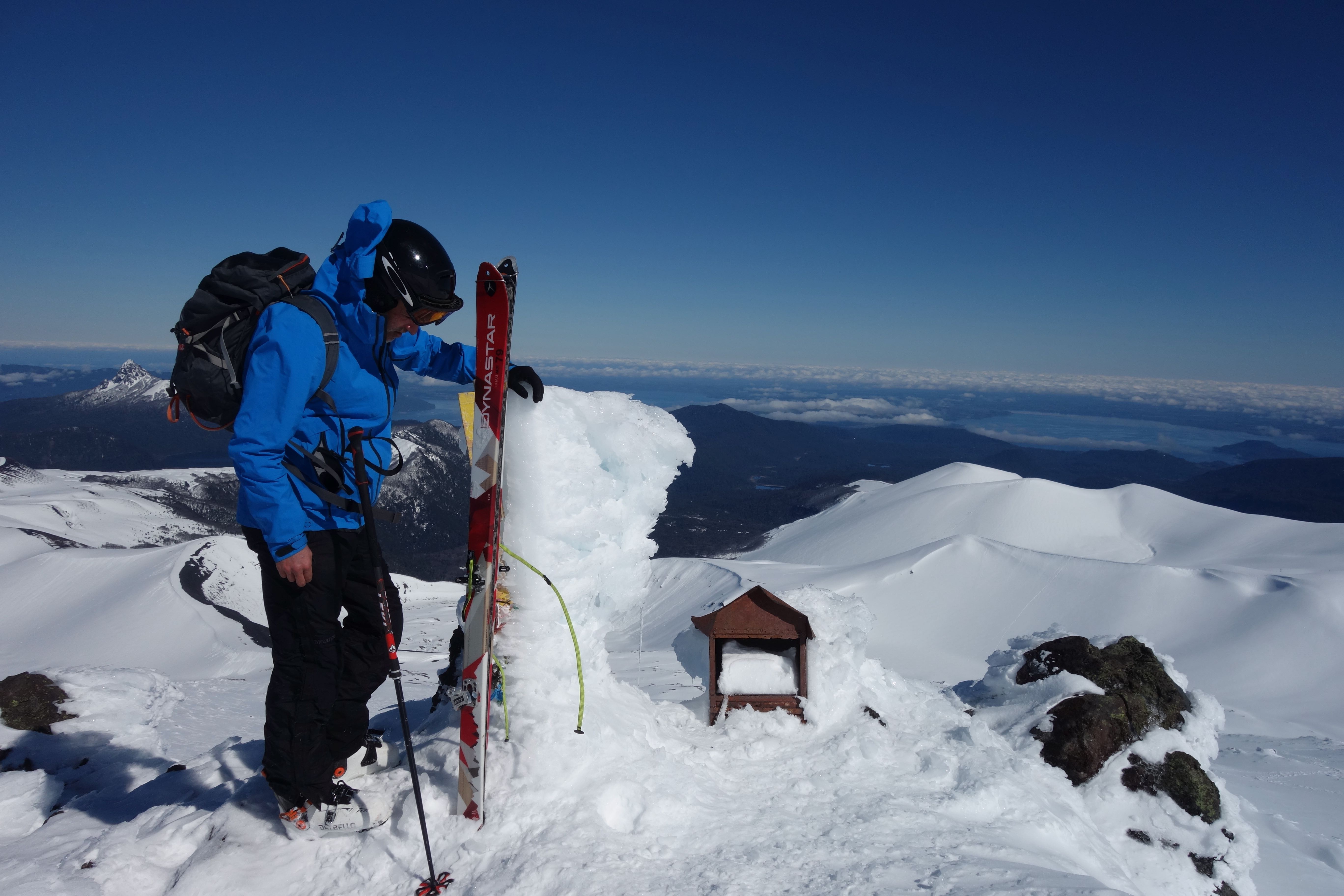 Pasadas las 11AM, junto al hito de la cumbre (una mini caseta). Foto orientada hacia el Poniente. Se alcanzan a ver un poco el Puyehue y el Rupanco. Condiciones ideales de la nieve para el randonée. Ascensión desde el estacionamiento de Antillanca hasta la cumbre, sin sacarse los esquíes. Salí a las 8.10h y llegué a las 10.39h (~2,5h). Una hora de bajada de esquí por nieve virgen en muy buenas condiciones. Día despejado con mucho viento en la cumbre. No vi otros ascensionistas. Preciosa cumbre.