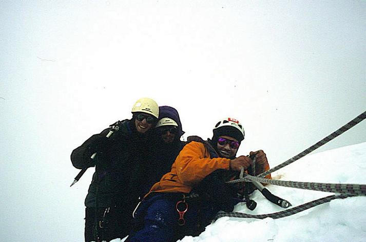 De izquierda a derecha, Cristóbal Cox, José Piquer y Mauricio Durán, en medio de las nubes, en la cumbre norte de la pirámide. Muy entretenida escalada, encontramos nieve en perfectas condiciones. El día nublado nos impidió disfrutar de la vista desde la cumbre. Salimos a las 4 de la mañana del campamento a 5.100, llegamos a la cumbre a las 12:15, y estábamos a las 5 de la tarde de vuelta en la carpa.