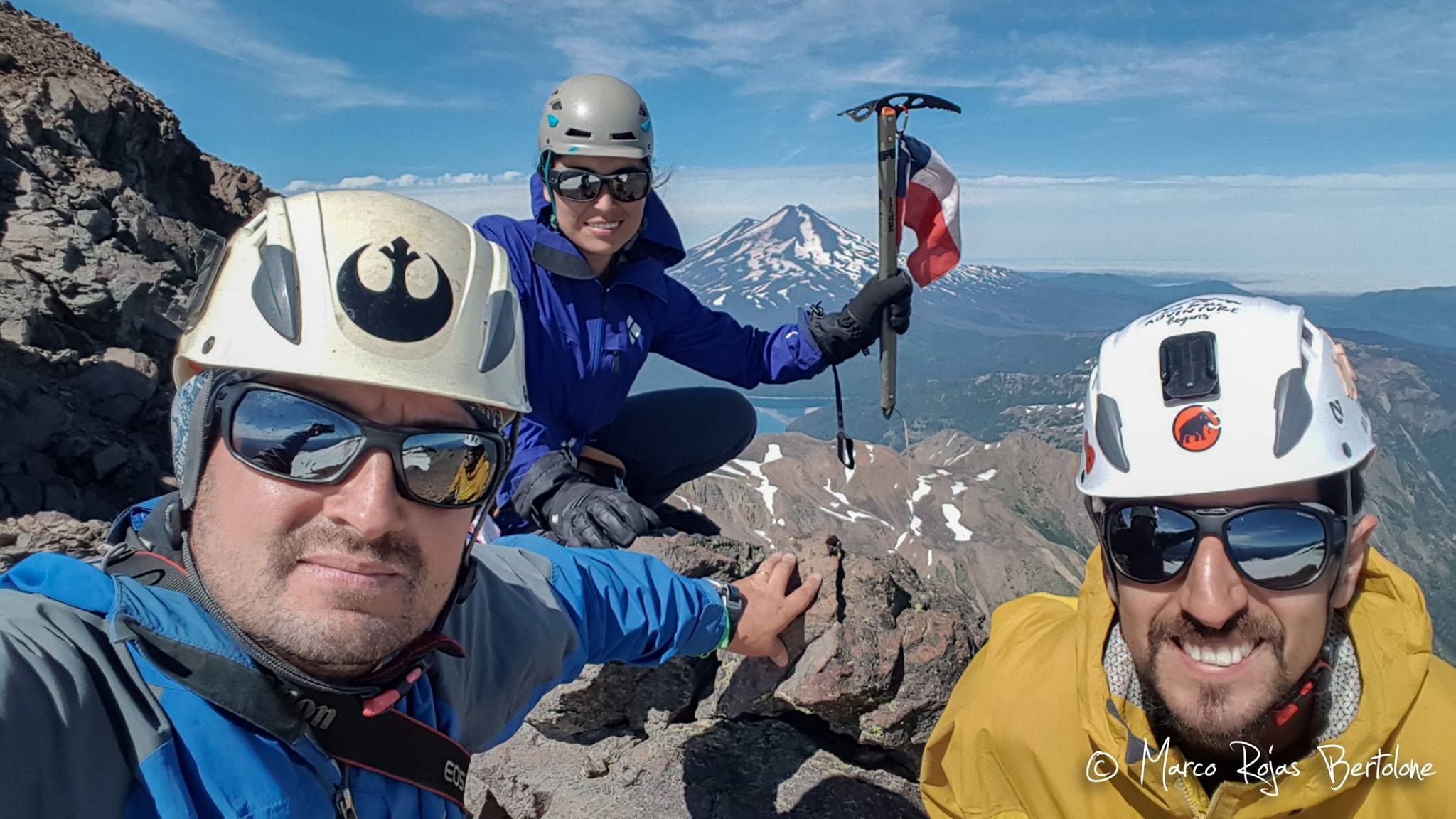Imagen tomada justo bajo la cumbre en un sector seguro, en ella salimos los tres integrantes de esta aventura y de fondo el Parque Nacional Conguillio. Mi segunda oportunidad por esta ruta, gracias a la primero escribí acá la ruta.