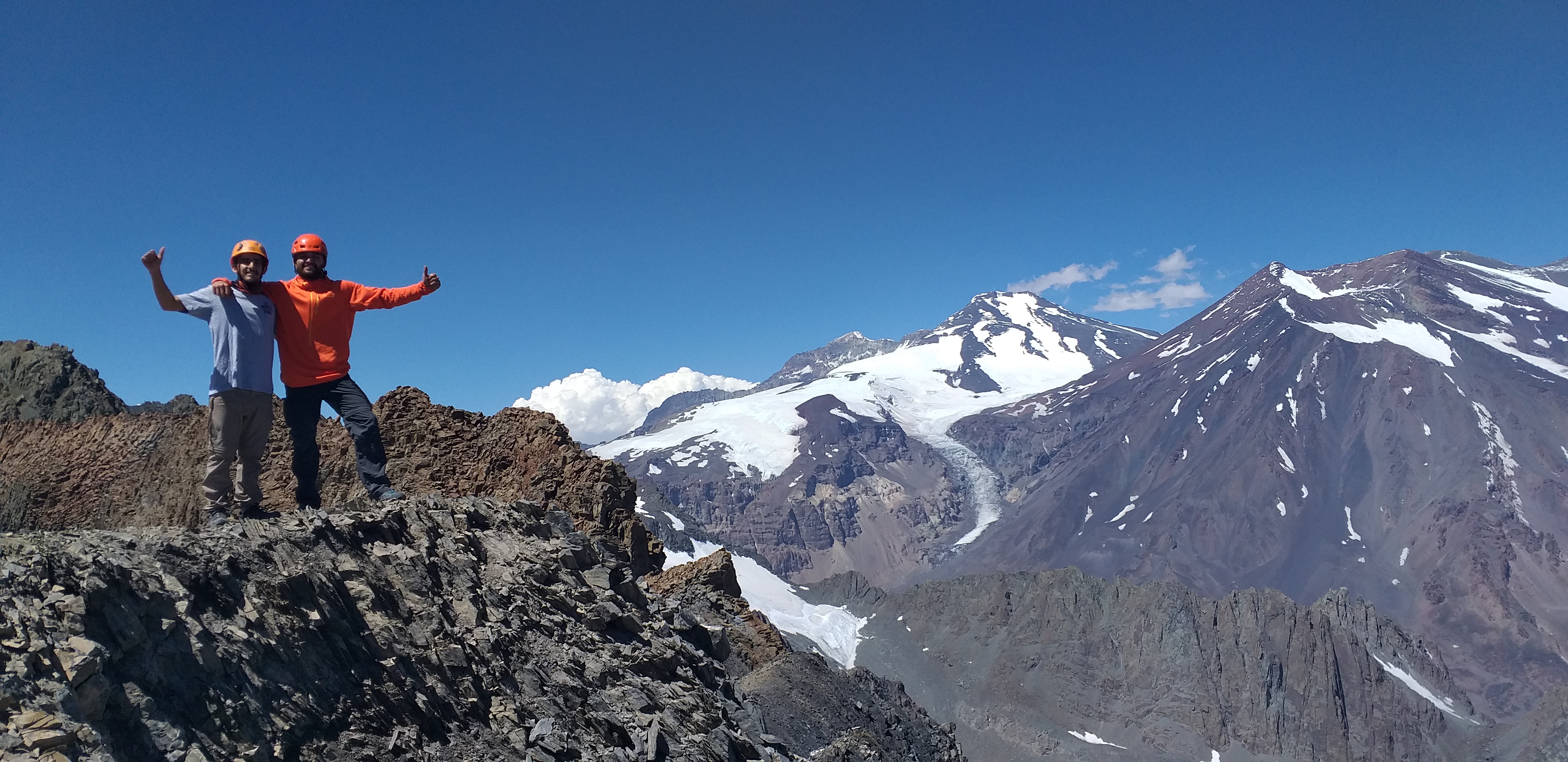 Punto alcanzado: 4153 m • Participantes: Lizet Mondaca, Angelica Ancaten, María Fernanda Castro, Andrea Parra, David Hidalgo, Eduardo Morales, Paul Castillo, Roberto Donoso, Fernando González. (todos socios DAV) • Comentarios: Nos reunimos el sábado a las 10 am en la Shell que esta ubicada en avenida La Florida, desde ahí y en 3 vehículos nos movimos hacia baños morales para almorzar muy temprano, después de eso pasamos el cabrerío y llegamos luego al control del Parque Arenas (habíamos pedido permiso previamente) para luego continuar al estacionamiento no oficial (pasado la Bocatoma). Primer desafío cruzar el rio Morales, luego comenzamos a ascender hacia el CB del Arenas, porteamos toda el agua hacia el CB, armamos campamento y disfrutamos un hermoso atardecer con vistas muy bellas. Noche sin luna y con eso logramos apreciar una noche estrellada inolvidable. A la mañana siguiente 6 am comenzamos a caminar, sorteamos un desgastante acarreo y nos movimos cautelosos y todos juntos por las piedras, muchos desprendimientos, mucha piedra suelta, llegamos a 4153 m debajo de la cumbre y rodeados de roca en formas de agujas y farellones, al medio día decidimos bajar, de los 9 habían 2 lesionados, llegamos al campamento base, comimos, desarmamos y nos tomamos la poca agua que nos quedaba. ¡¡¡Vamos a volver, pero a la salida del invierno!!!, nos encantó el lugar, conocernos, encontramos muchos fósiles, específicamente conchas, gastrópodos, cefalópodos y bivalvos.