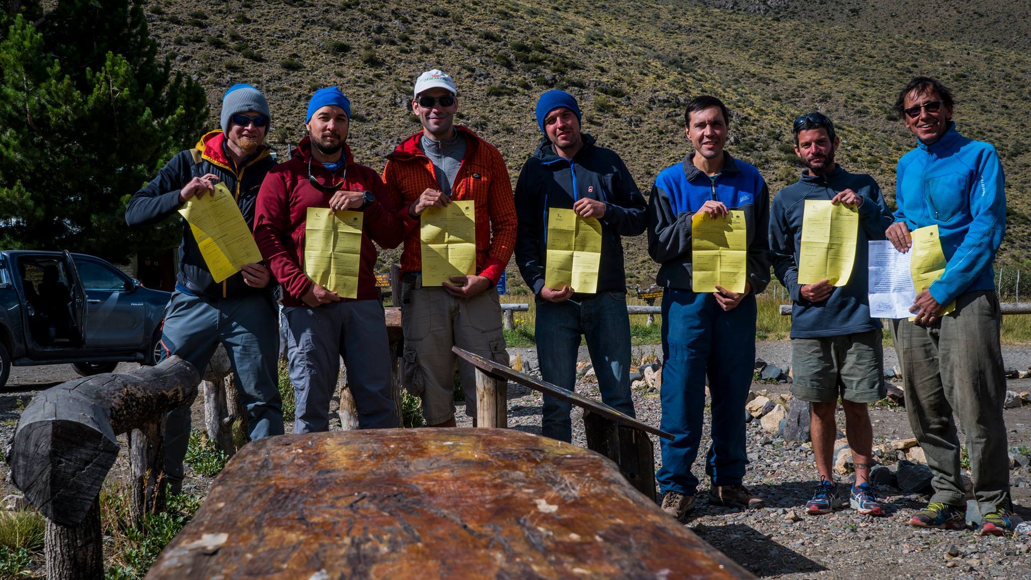 Antes de irnos tuvimos problemas con la administración del parque Laguna Diamande quienes no nos dejaban irnos por que supuestamente el camino se encontraba peligroso debido a las nevazones. Tuvimos que firmar esos papeles amarillos que notifican que nos Un grupo de siete andinistas, cuatro argentinos, un venezolano y dos chilenos en un acto de fraternidad sudamericana quisimos ascender este icónico volcán. Para los chilenos parece absurdo tener que salir del país para ascender una montaña que, de no ser por el cerco privado, sería de fácil y cercano acceso desde Santiago. La montaña no conoce de limites ni fronteras. Luchemos por el libre acceso a ellas! Cumbre bajo una tormenta.