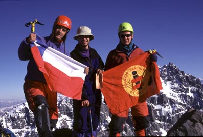 En la foto, la cordada Camus-Cox-Valenzuela en la cumbre del Pico Negro, Club Andino Padre Alberto Hurtado. El Pico Negro nos llamó la atención cuando ascendimos el Punta Negra (un mes antes)... ese mismo día decidimos volver al Embalse del Yeso a escalar este desconocido cerro, que pese a tener una ruta muy entretenida, acapara pocas miradas... Ascención altamente recomendada.