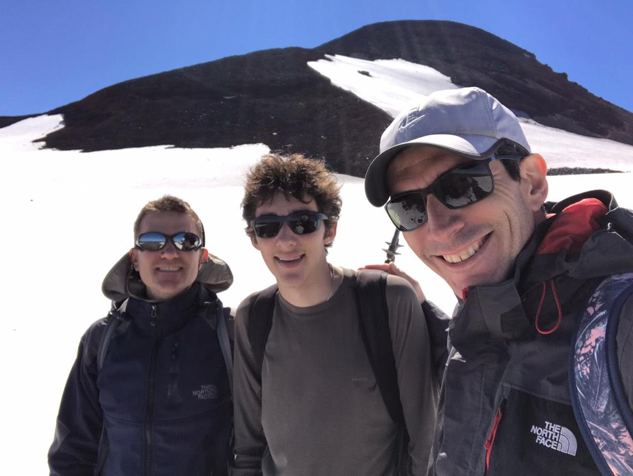 Hermanos Juan y Dante Cox, 16 y 13 años respectivamente, por primera vez juntos en la cumbre del Mocho. Día despejado con poco viento durante todo el día. Altas temperaturas. Partimos desde el camping/refugio concesionado por Conaf en Río Blanco (por Enco). 1h aprox. al mirador de la Tumba del Buey, y poco más de 2h a la montada al glaciar. Desde ahí todo se demoró mucho. El glaciar se encuentra muy retrocedido, abierto y resquebrajado. Nidos de grietas por todas partes. Hay que realizar una travesía encordados y con piolet y crampones. Nosotros creímos mejor ascender hacia el sureste, por donde creíamos que había menos grietas y la travesía era por neveros planos. Pero error. No hay que innovar. Lo mejor (y que comprobamos a la vuelta) es hacer la travesía por donde discurre la ruta siempre (ver track), en diagonal hasta la lengua de nieve bajo el espolón que sube a la cima en