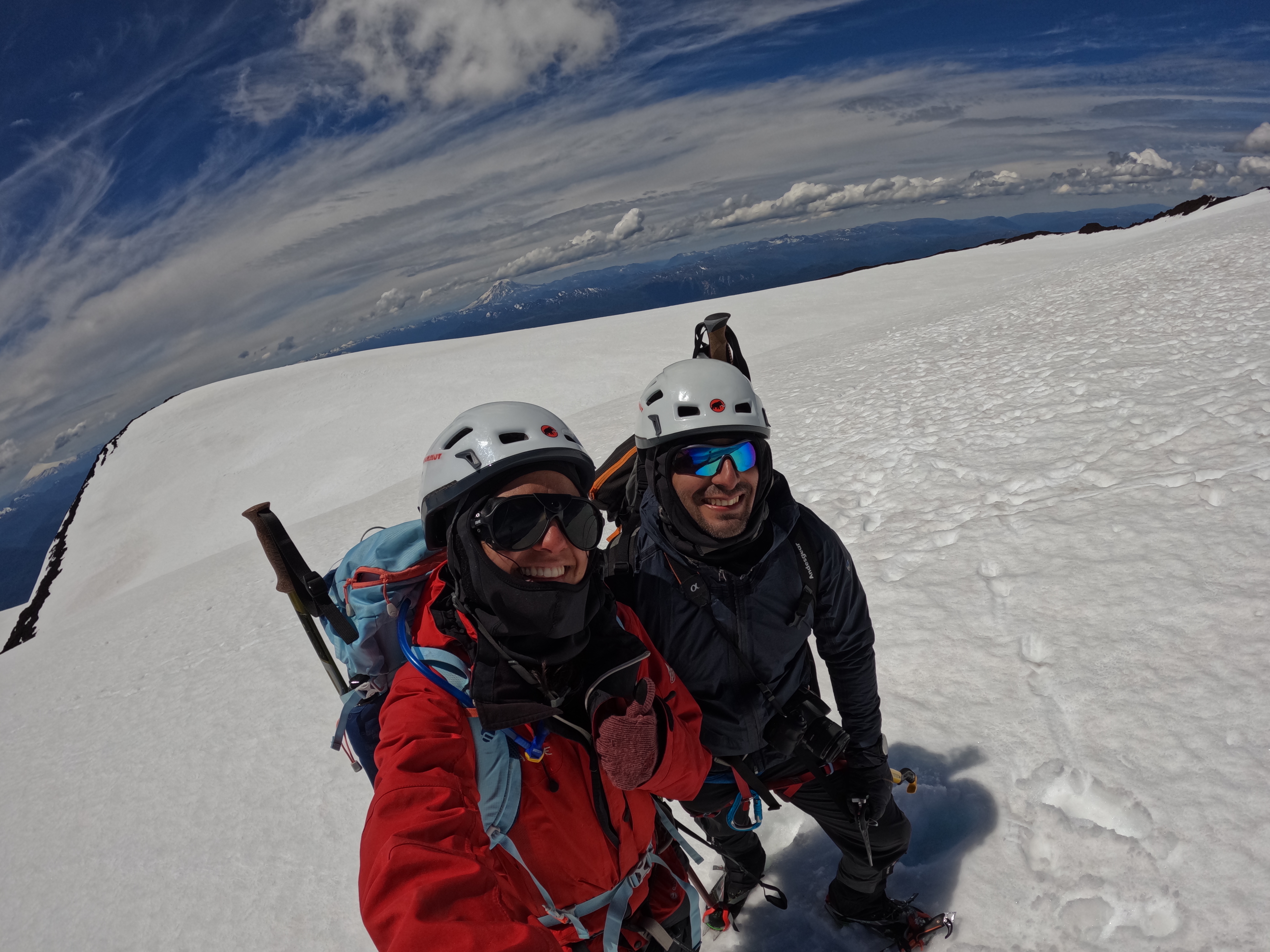 Ya en la mañana, alrededor de las 7:30, iniciamos el recorrido hacia el Mocho. Luego de una hora de caminata llegamos a la Tumba del Buey, donde descansamos para apreciar el bello lugar. Posteriormente, retomamos el trekking por dos horas más, hasta llegar a la base de los volcanes. Desde la base hasta la cumbre nos encontramos con acarreos y neveros y, previo a alcanzar la cumbre, decidimos usar crampones debido al hielo en el sector. Finalmente, a las 12 horas, llegamos a la cumbre. Desde ésta se puede observar la cumbre del Villarica, Lanin, Quetrupillán, Tronador, Puyehue, Puntiagudo, y Osorno, junto con las impresionantes vistas a los lagos de la zona.