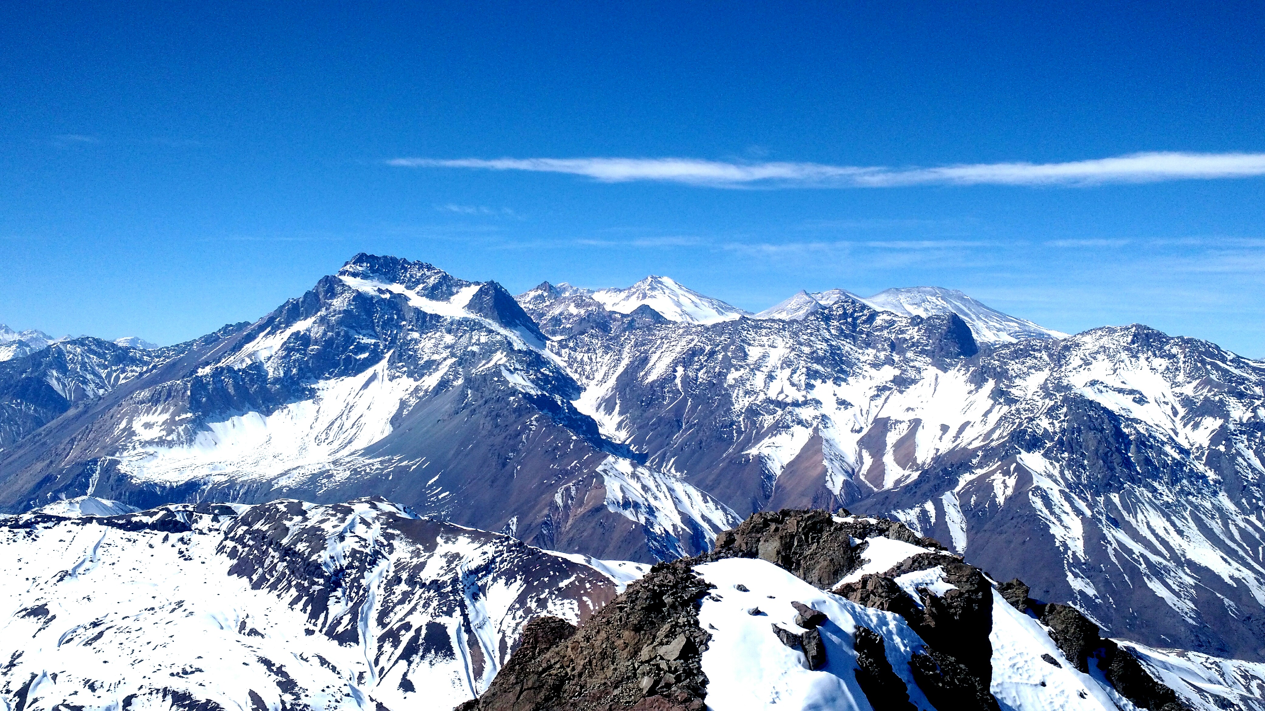 Vista a filo norte y cara oeste del cerro Peladeros completamente nevado. A la derecha atrás del Peladeros se esboza el cerro Dedo de Dama. 5-6-2016.