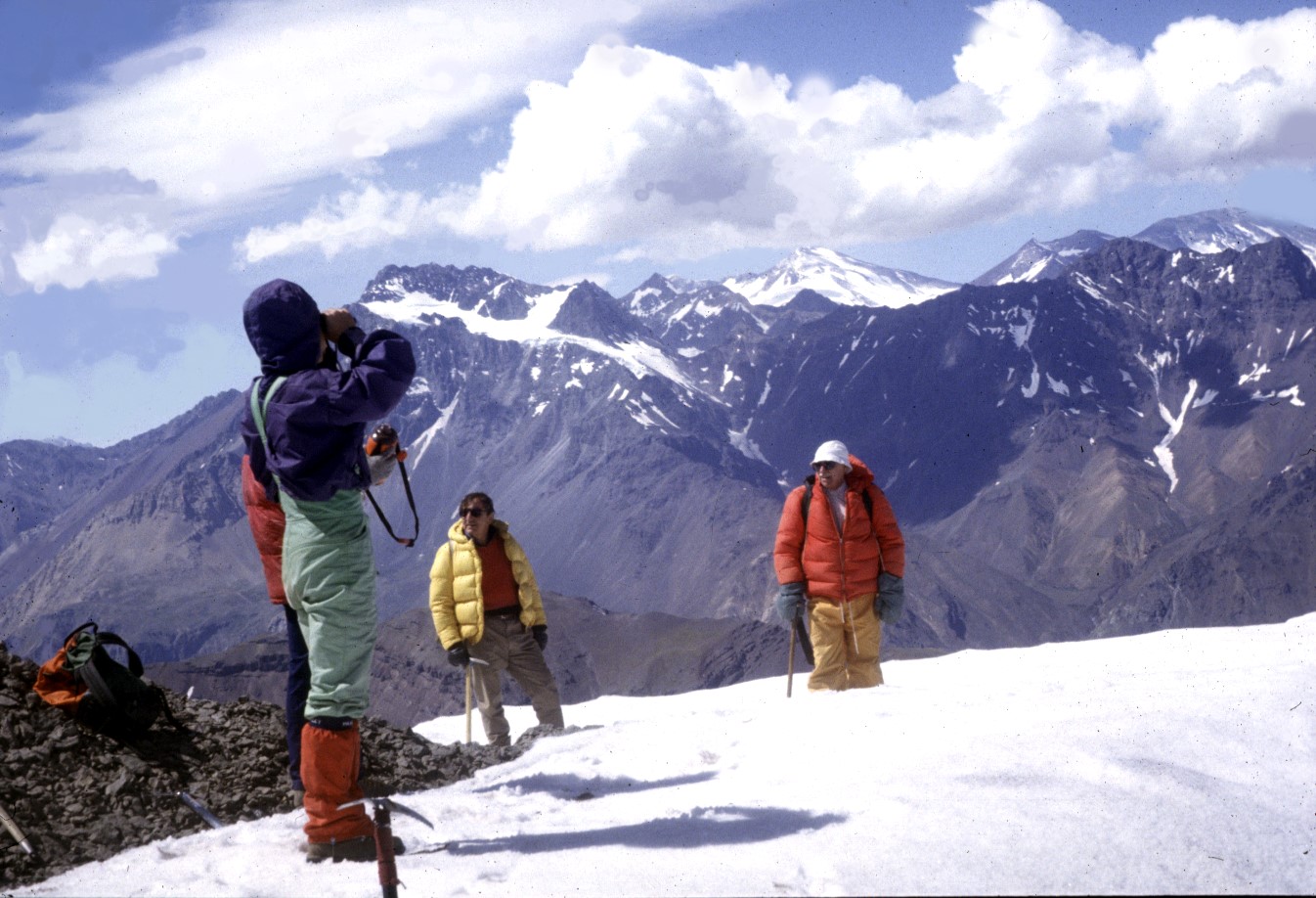 Vista a filo norte y cara oeste del cerro Peladeros completamente nevado. A la derecha atrás del Peladeros se esboza el cerro Dedo de Dama. 5-6-2016.