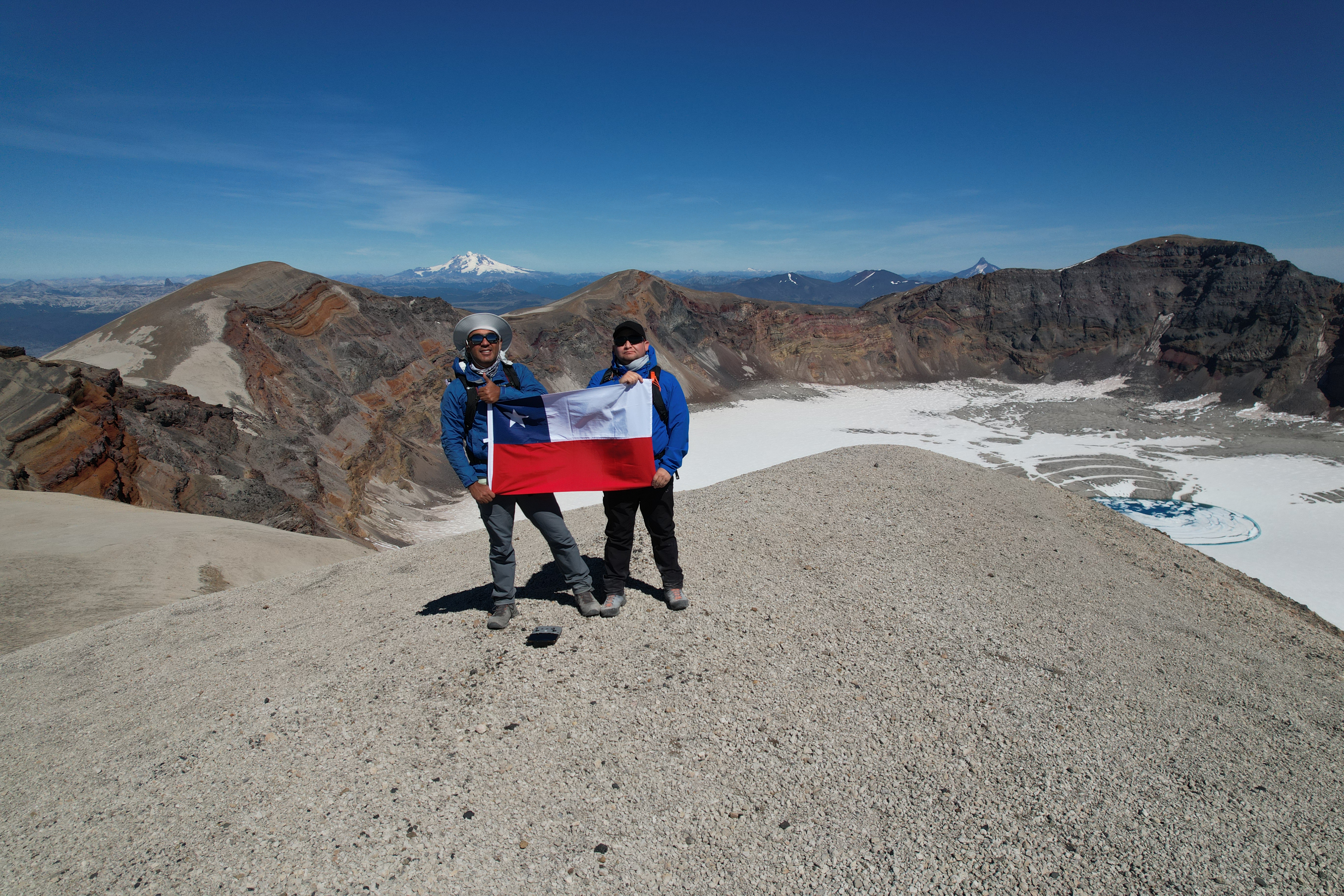 Foto con dron Cumbre con Sandro Padilla. Clima perfecto durante la jornada. Nos demoramos 4,5 horas en el ascenso a ritmo relajado. Dos horas en la vuelta. Increíble el paisaje que dejó la erupción de 2011, todo cubierto de cenizas. Y el baño termal al regreso hizo redonda la experiencia. Muy recomendable.