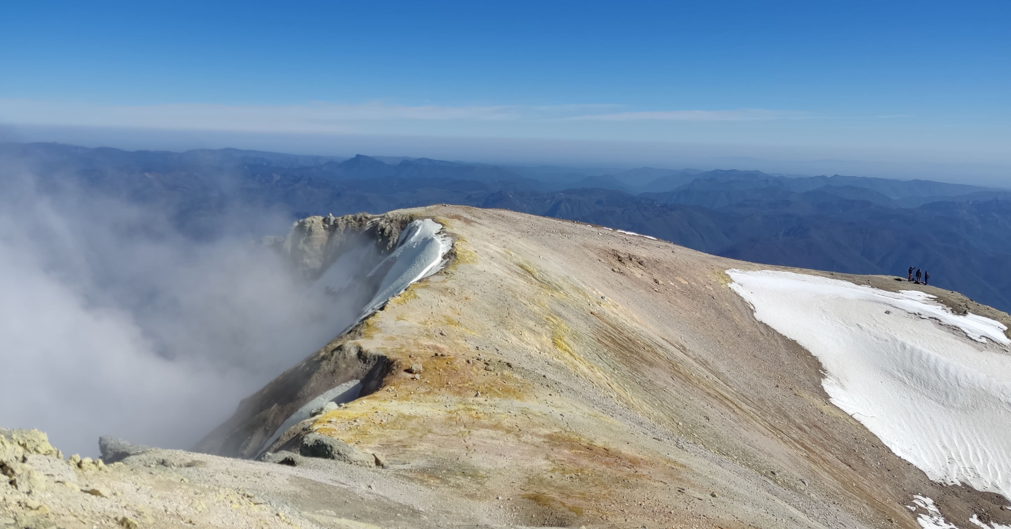 El campamento a 1.840 m no tenia agua, por lo que es recomendable ascender hasta el filo y alli existe un nevero y lagunitas donde acampar. Avanzamos por el filo, montandonos por un paso de roca que da en una pasada casi llegando al torreo final, al borde del glaciar, desde el cual bordeando la arista dentro del crater, alcanzamos la cumbre. El track a descargar acá esta muy generico y es mejor leer las huellas que dejarse guiar por el archivo sugerido