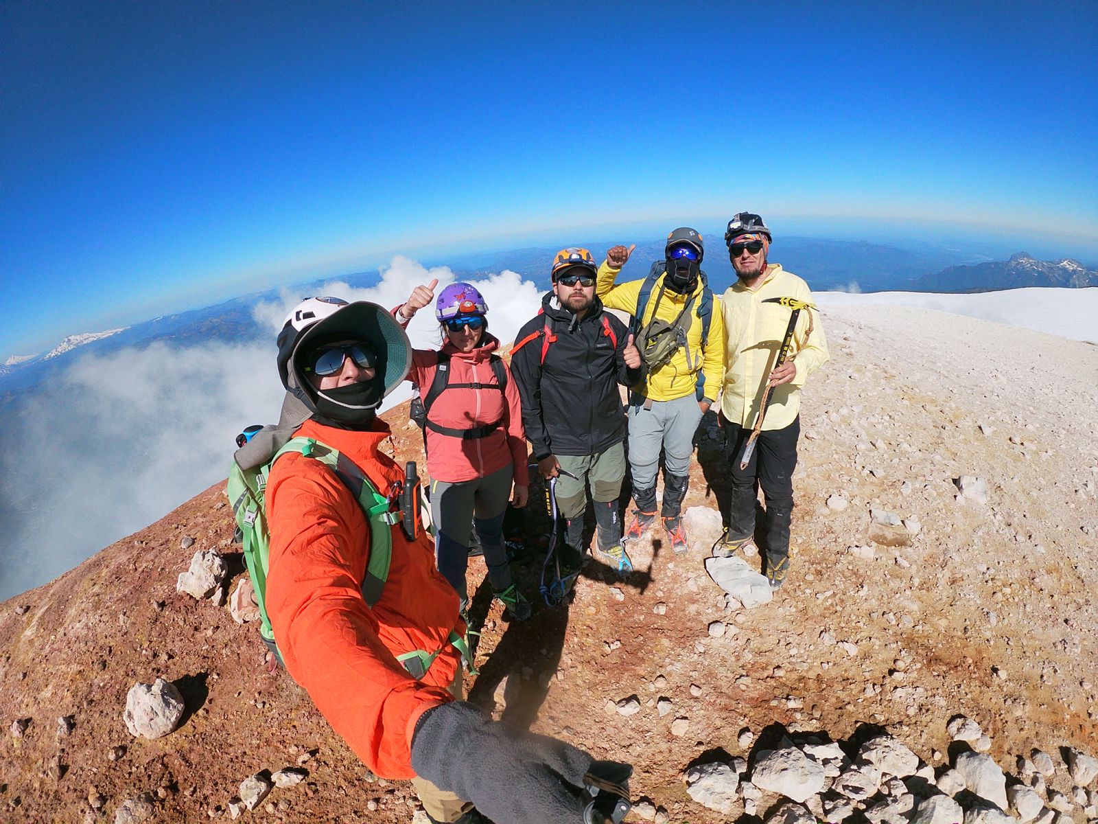 El campamento a 1.840 m no tenia agua, por lo que es recomendable ascender hasta el filo y alli existe un nevero y lagunitas donde acampar. Avanzamos por el filo, montandonos por un paso de roca que da en una pasada casi llegando al torreo final, al borde del glaciar, desde el cual bordeando la arista dentro del crater, alcanzamos la cumbre. El track a descargar acá esta muy generico y es mejor leer las huellas que dejarse guiar por el archivo sugerido