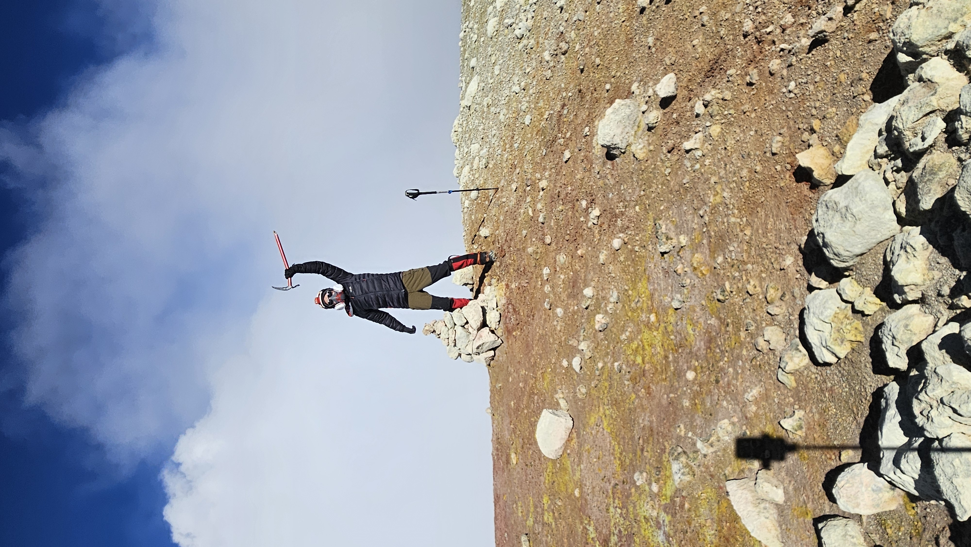 El campamento a 1.840 m no tenia agua, por lo que es recomendable ascender hasta el filo y alli existe un nevero y lagunitas donde acampar. Avanzamos por el filo, montandonos por un paso de roca que da en una pasada casi llegando al torreo final, al borde del glaciar, desde el cual bordeando la arista dentro del crater, alcanzamos la cumbre. El track a descargar acá esta muy generico y es mejor leer las huellas que dejarse guiar por el archivo sugerido