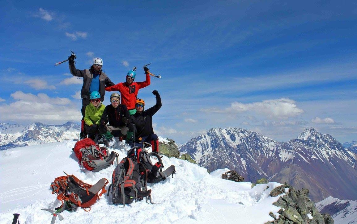 En cumbre (der-izq abajo), del Club Chileno-Suizo Paulo Mallea, Andrés Parra, Irene Suter (pie der), Pablo Cea, David Ferreira de Andes-Outdoor.cl. Gran cerro, grandes cordadas. Descripción de AH al dedillo las fotos, no así los tiempos, pero acostumbrados. Tomó la foto un montañista Español?