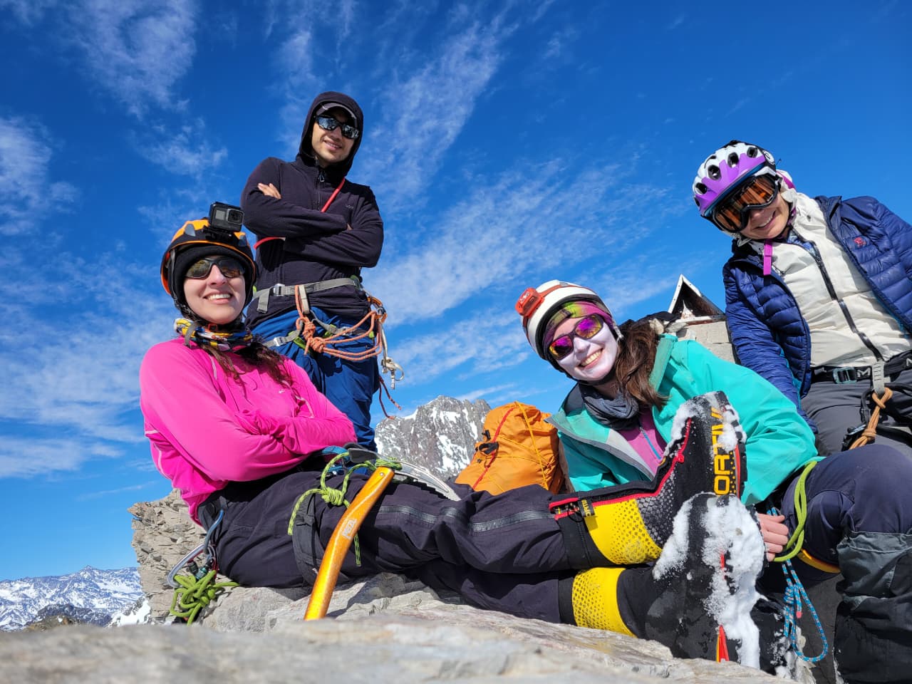 Cumbre realizada en 2 días. La nieve en el canalón la encontramos en muy buenas condiciones, ideal para una rápida progresión y la escalada debe realizarse con calma, puesto que la roca es de muy mala calidad y tiene poco donde proteger, lo que la hace muy psicológica.