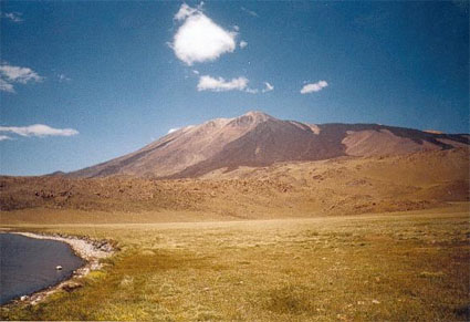 Otra imagen del Tromen desde el cerro Wayle, o sea desde el oeste. En esta se aprecia claramente la colada de lava que desciende por la cara oeste. A la derecha de ella realizamos el ascenso con unos 1900 mts. de desnivel.