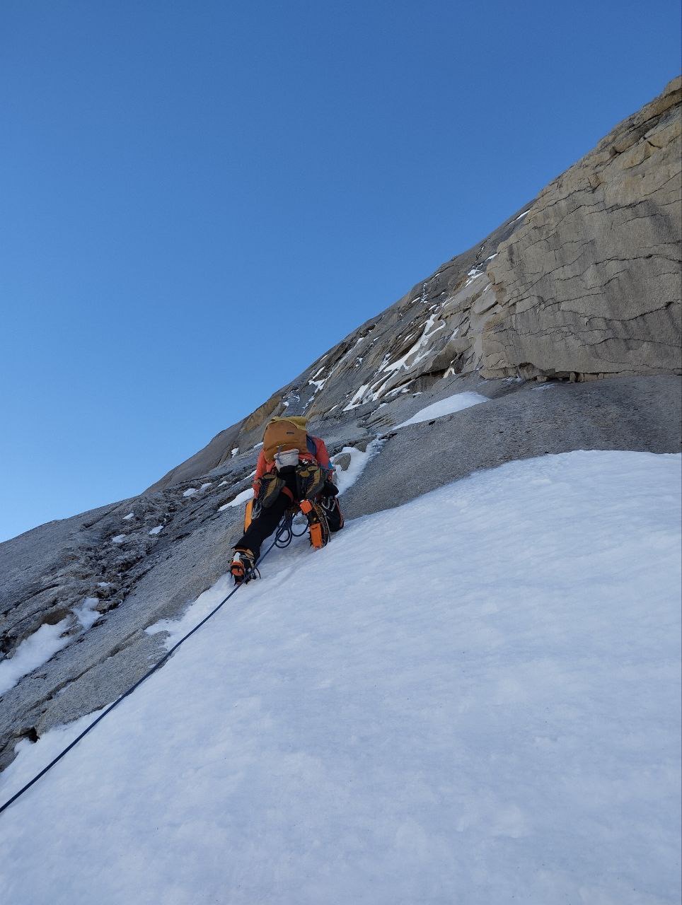 Imponente cerro aleta! Una escalada con mucha nieve y hielo en las fisuras. Escalamos con condiciones mixtas los primeros 3 largos en simultáneo (180m), para posteriormente ponerme los gatos en algunas pasadas algo más verticales. Una escalada que sacó nuestro mejor repertorio de recursos!