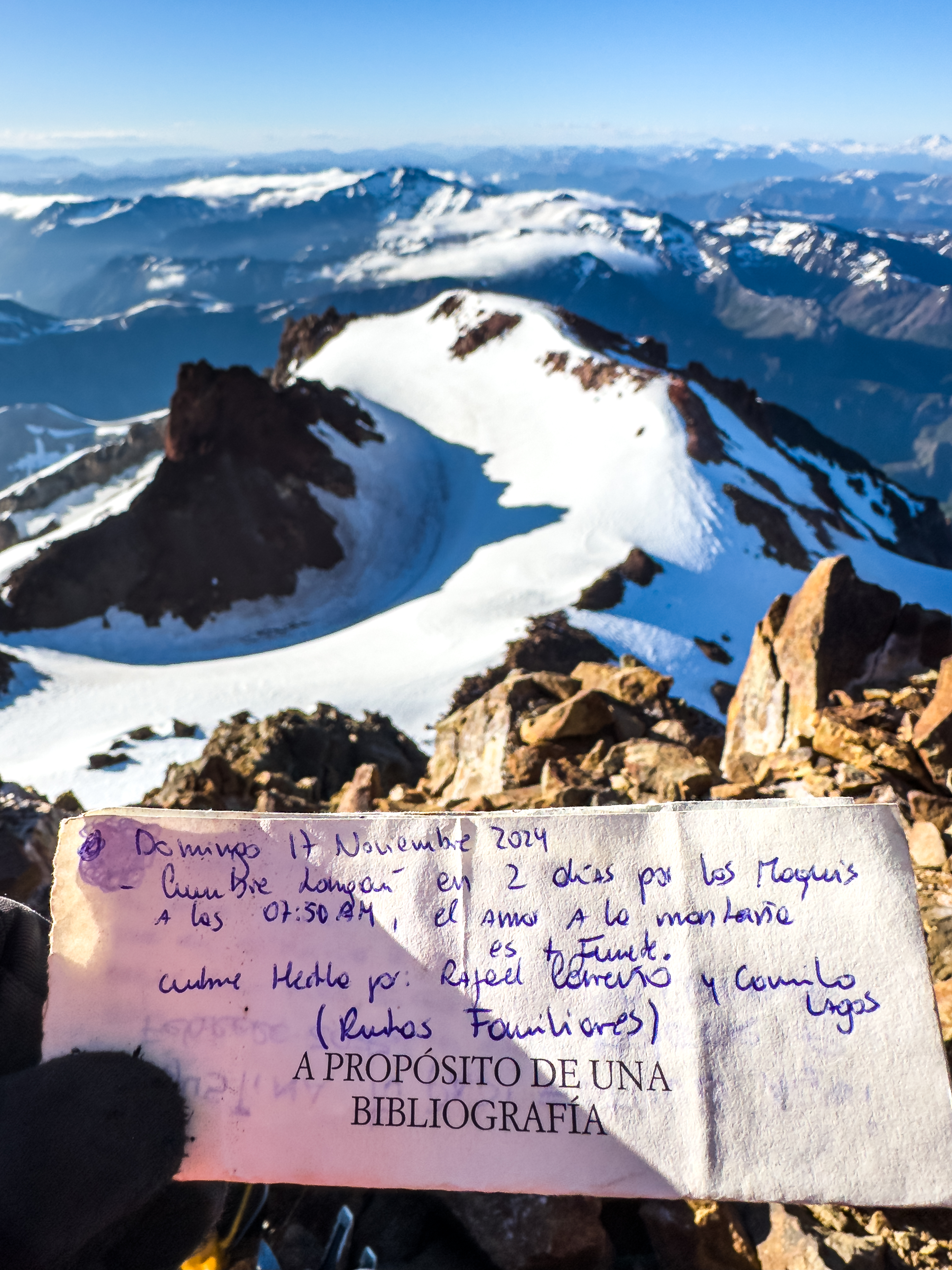 Hicimos cumbre en 2 dias, por la ruta de los Maquis, Partiamos el Sabado 16 desde Monte oscuro a las 05:00am para cruzar el cable de acero en el km5 hasta el otro lado del rio achibueno, posterior el cruce nos fuimos directo al base antes de laguna los patos para asi el Domingo 17 atacar cumbre, haciamos cima a las 07:50am. bajando todo esos 39km de descenso hasta el vehiculo llegando a las 20:45hrs.