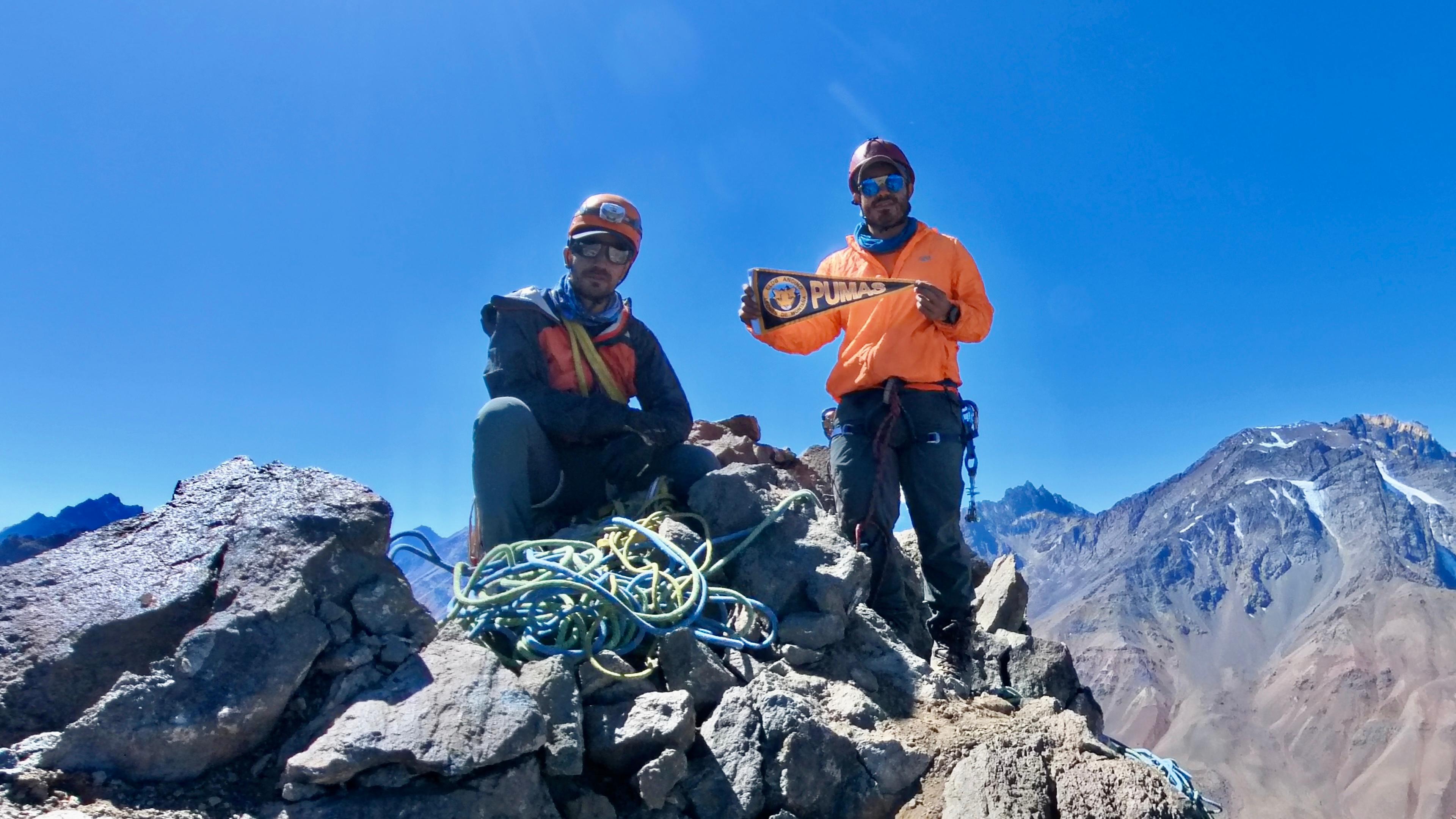 Fede y Álvaro en la cumbre Luego de dos intentos previos en 2021 y 2022, donde tambien nos acompañó Patricio Middleton, emprendimos un tercer intento en marzo del 2024, escogimos la misma ruta que habiamos intentado previamente, por el filo este desde la canaleta central.