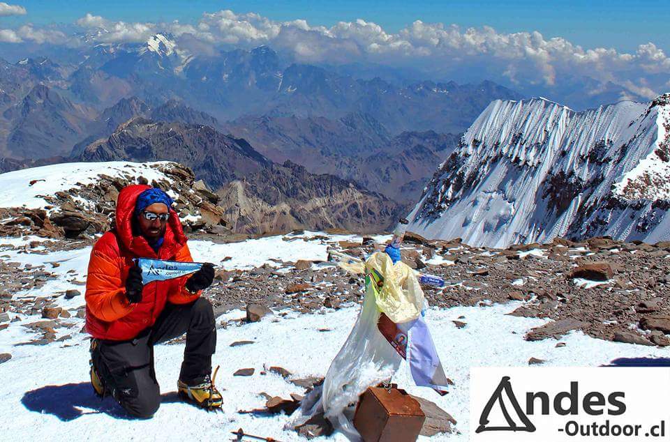 Foto en cumbre de Aconcagua 7/2/2018 guiando a Rosita Rojas skyrunner Guiando a Rosita Rojas (Skyrunner) para Andes-Outdoor.cl. Comenzamos madrugada del sábado 3/2 desde Santiago. Permisos, almorzar en Cruz de Caña LANKO y partir a Confluencia. 4/2 temprano a Plaza de Mulas dónde esperamos las 24 horas pase médico. 5/2 tarde con pase médico salimos a Nido, pero por tormenta alojamos en Canadá. 6/2 a Nido de Cóndores. 7/2 a cumbre después de nevada, ruta tapada por Berlin y un rato de descanso haciendo agua caliente, pero conozco ruta y seguimos a Independencia. Traverse nieve dura se levantaba un poco de nieve polvo. Las Cuevas descanso y subida a cumbre 15pm en 12 horas, 2 horas más lento que año pasado. Varios chilenos en cumbre. Regreso a Nido y bajada el 8/2 a Plaza de Mulas. Anécdota: en traverse escuché decir a alguien por ahí "viento blanco" y con eso él bajó y otros con él bajaron, error, solo era nieve polvo levantada por el viento, en Aconcagua mucho viento.