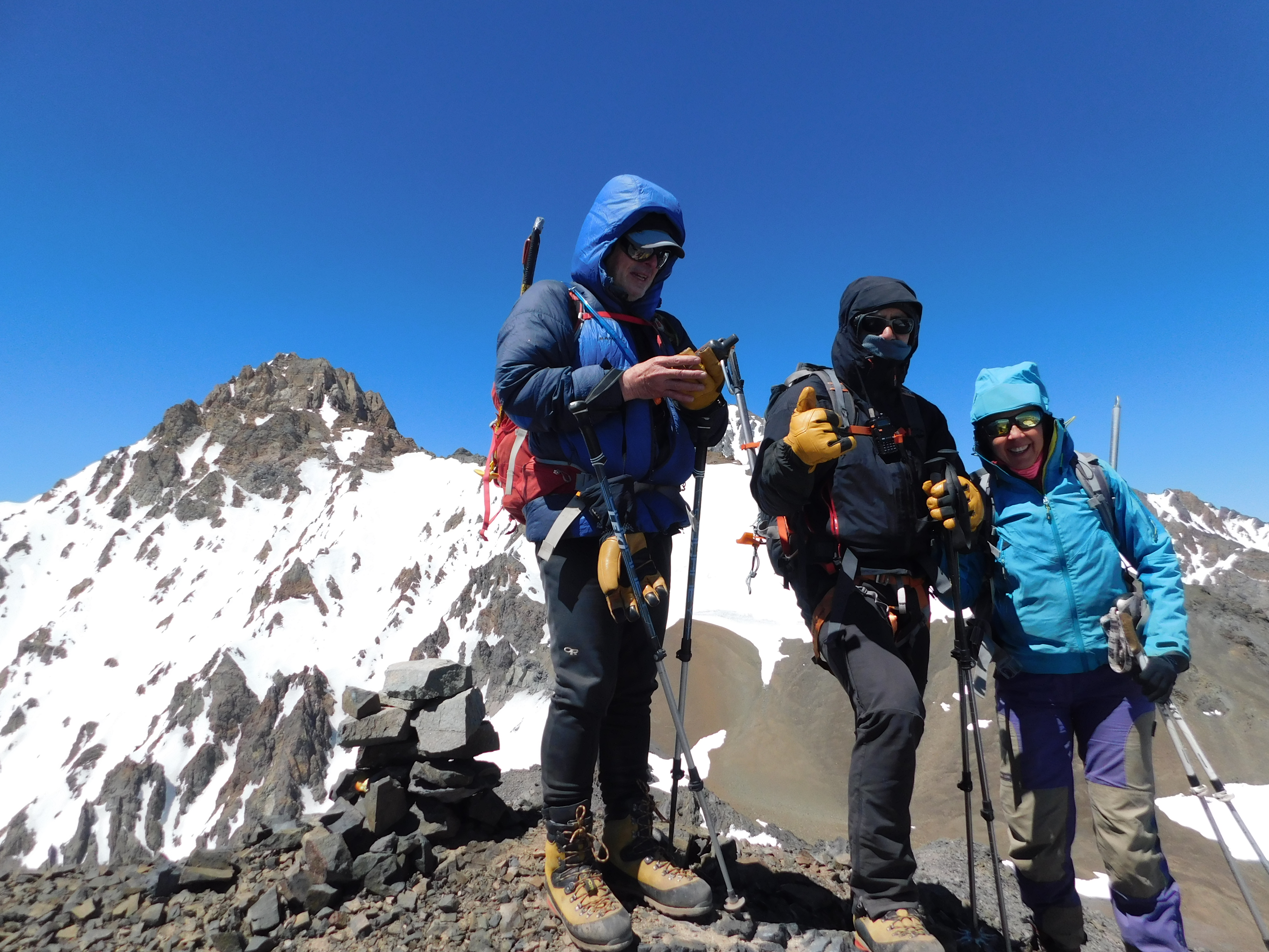 El cerro resultó ser más fácil de lo esperado, aunque la jornada de cumbre se hace larga porque el campamento está muy abajo. Si se pudiera acampar más arriba, se podría acortar el día de cumbre. Hay huellas marcadas hasta la cumbre misma. No necesitamos crampones ni piolet para el ascenso. Para el descenso intentamos pasar al cerro Negro Gemelos, pero nos desviamos por una huella que salía del filo y nos alejamos de la cumbre. No se veía de forma evidente cómo recorrer el filo para alcanzar esta otra cumbre.