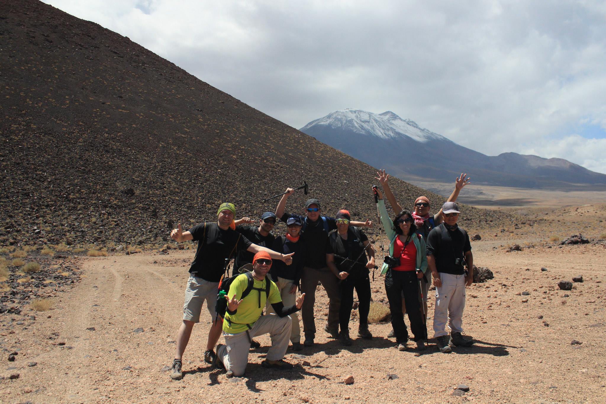 Cordada Poruña Trip 2015; en la base del cono. De fondo el Volcán San Pedro. Poruña es una gran alternativa para quienes desean acercarse y conocer el montañismo; no sólo por la baja exigencia que implica ascender a este cono (150 metros de ascenso), sino que también para evaluar los efectos de la altura en un espacio relativamente controlado y cercano a centros poblados. Definitivamente es una gran alternativa para la familia y para todas aquellas personas que gocen de la naturaleza y la fotografía, al ser Poruña un mirador natural de las bellezas del Alto El Loa.