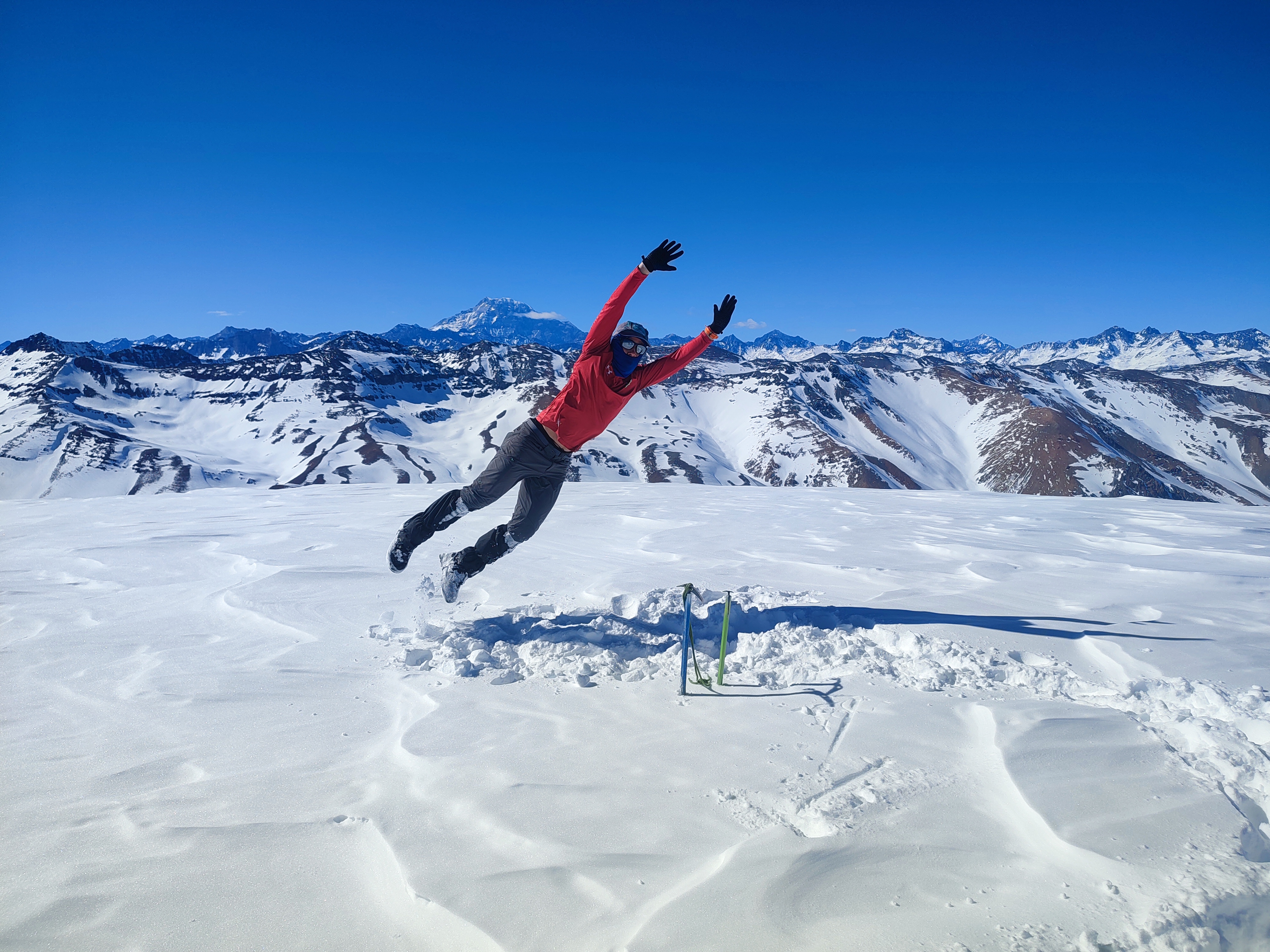 A pesar de que las condiciones de la nieve no eran las mejores, tuvimos un muy buen día con cumbre y descenso esquiando. Salida del DAV Santiago.
