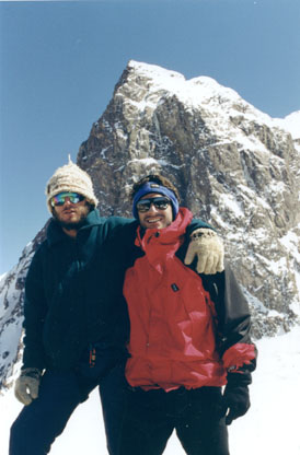 Alfredo Illanes (Tajo) y Jaime Ruiz-Tagle celebran la vistaza que regala el Mirador. 6 hrs 30 minutos desde la laguna. Cometimos el error de subir por la canaleta que es apiedrada constantemente. Con suerte salimos ilesos. Fuimos los únicos cumbreros ese fin de semana. Hasta muy arriba llegaron montañistas que avanzaban por la pesada nieve con esquíes randonés. No siguieron más allá cuando vieron nuestra batalla con las piedras que se avalanzaban sobre nuestras cabezas. La falta de información nos llevó a la trampa.
