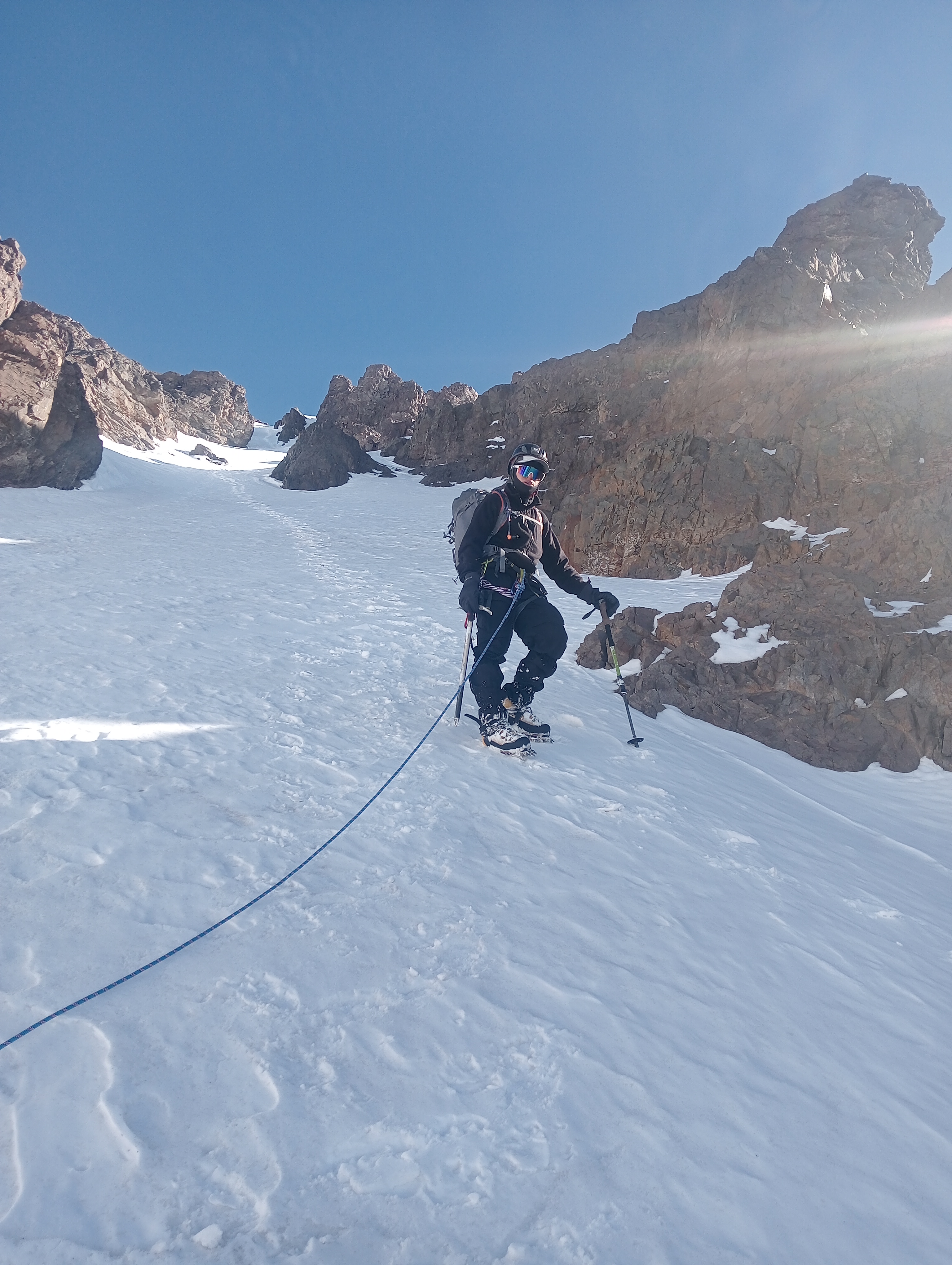 un exigente canalón que se encontraba con buena calidad de nieve para ascender. Se logra una gran vista de diferentes cerros de la zona.