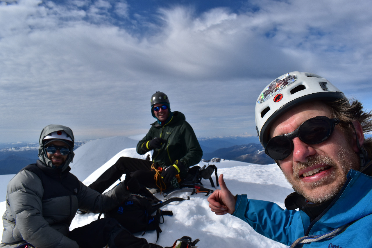 Cumbre lograda en dos jornadas. Primer día desde pórtico Conaf hasta Tumba de Buey. La jornada de cumbre comenzó a las 5:30, logrando la cumbre Norte a las 11:30 aprox. La ruta elegida fue por el canalón central de la cara norte. Primera sección de roca suelta, luego una pequeña pala de nieve hasta el filo, para finalmente ataca la cumbre por el filo central. Buenas condiciones de nieve, permitió colocar un seguro intermedio (estaca) y anclaje tipo deadman en la cumbre para todas las maniobras asociadas. Largo total de la vía; 45 metros aporx.