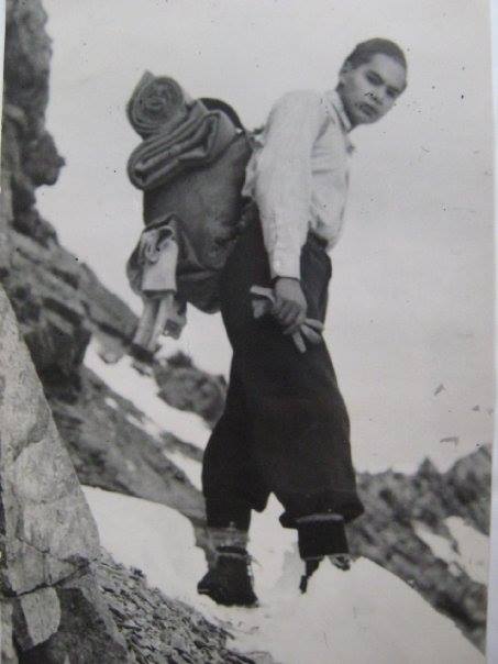 Enrique Vidaurrazaga en la salida al Serrucho en su primera ascención 1951 Dormimos una noche sobre hielo "en tres huesos", con un zapato en la cadera para no congelarnos. (portezuelo del serrucho en 1951)