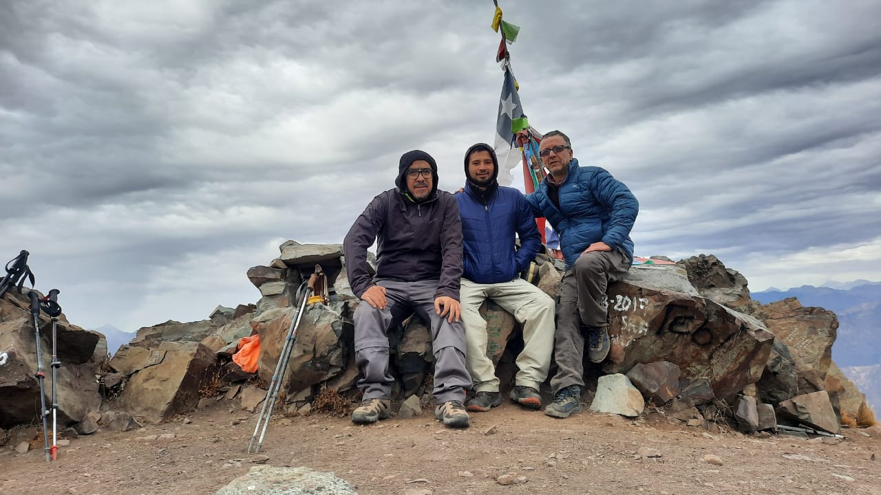 Mucho frio en la cumbre, mientras posábamos, nos caía encima una suave pero gélida granizada. Cuando estábamos por hacer cumbre, vimos en el segundo portezuelo a un grupo de 3 personas que se acercaba, pensamos que eran unos aficionados ya que habían comenzado su caminata bastante tarde, sin embargo, llegaron al poco rato justo cuando comenzábamos el descenso (incluso iban poco equipados) y nos pasaron corriendo como si fueran atletas de alto rendimiento y nos los vimos nunca más.