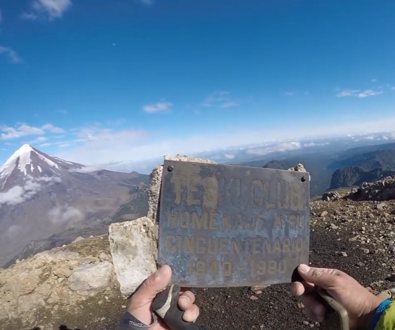 Placa dejada por los socios del teski en 1990. Salida en solitario, 7 horas ida y vuelta desdeThomas. Dia frio, buena visibilidad. El cerro esta “apretado”, sin nieve pero los acarreos bastantes firmes. Solo use un par bastones, no necesite equipo ni cuerda. Agua en un par de puntos pero no mucha. El libro antiguo esta en buen estado aun, el mas nuevo esta bastante mojado, lo deje al sol un rato. Tal vez una olla de aluminio mas grande como contenedor ayudaria.