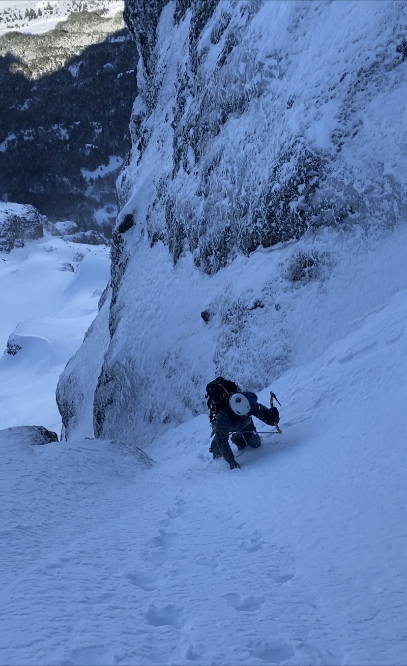 Subiendo por el penúltimo canalón de la Ruta "Canalón SurOeste", previo combinar la ruta con la parte de hielo final de la ruta "Garganta de un Selknam", la cual te deja justo previo al paso "el salto" Ruta Sur en condiciones óptimas! Bajamos por la Ruta normal, con algunos pasos en la parte final con poca nieve y el paso "el salto"en condiciones muy delicadas.