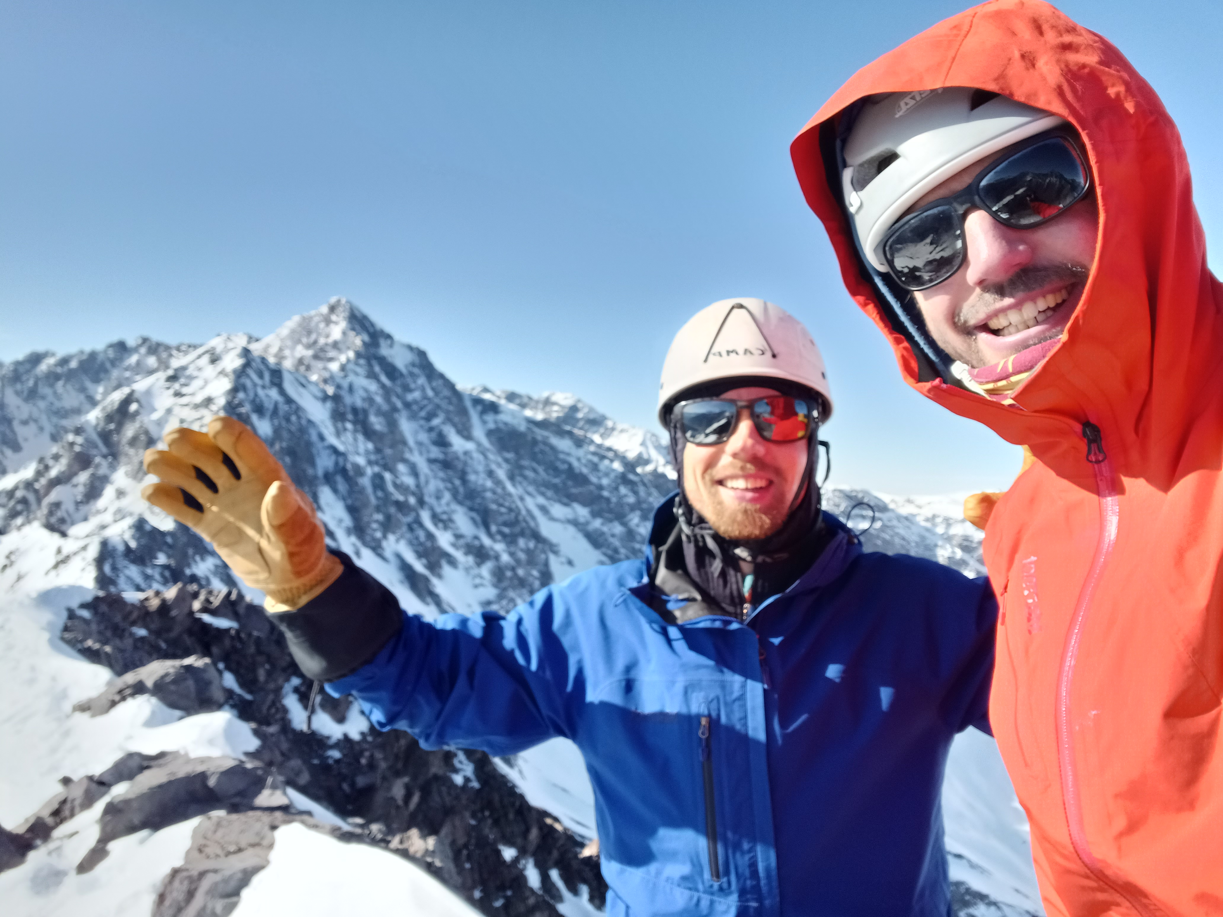 Nieve blando durante la aproximación, con frecuencia enterrábamos las piernas hasta las rodillas o más. Tardamos unas 8 hs porteando mochilas. Para la ascención, partimos como a las 4 am, para ingresar al canalón con luz (recomiendo salir más temprano, para asegurar cumbre y que haya menos caida de material). En el canalón cae mucho material, y en los pasos donde hay que trepar rocas (dentro del canalón), habían pasos con hielo muy duro, lo cual complicaba un poco cruzar ese paso. Subimos encordados con cuerda corta (5 mts), en la subida solo tuvimos que poner un friend (2do paso de roca). Como no llegamos a la cumbre, estábamos pasados de tiempo, finalizado el ascenso del canalón, bajamos por el mismo. La bajada fue con cuerda y desescalando. Tuvimos que hacer un rapel para no tener que desescalar el paso de roca más complicado. Dada la mala calidad de la roca, armar un rapel seguro, lleva su tiempo.