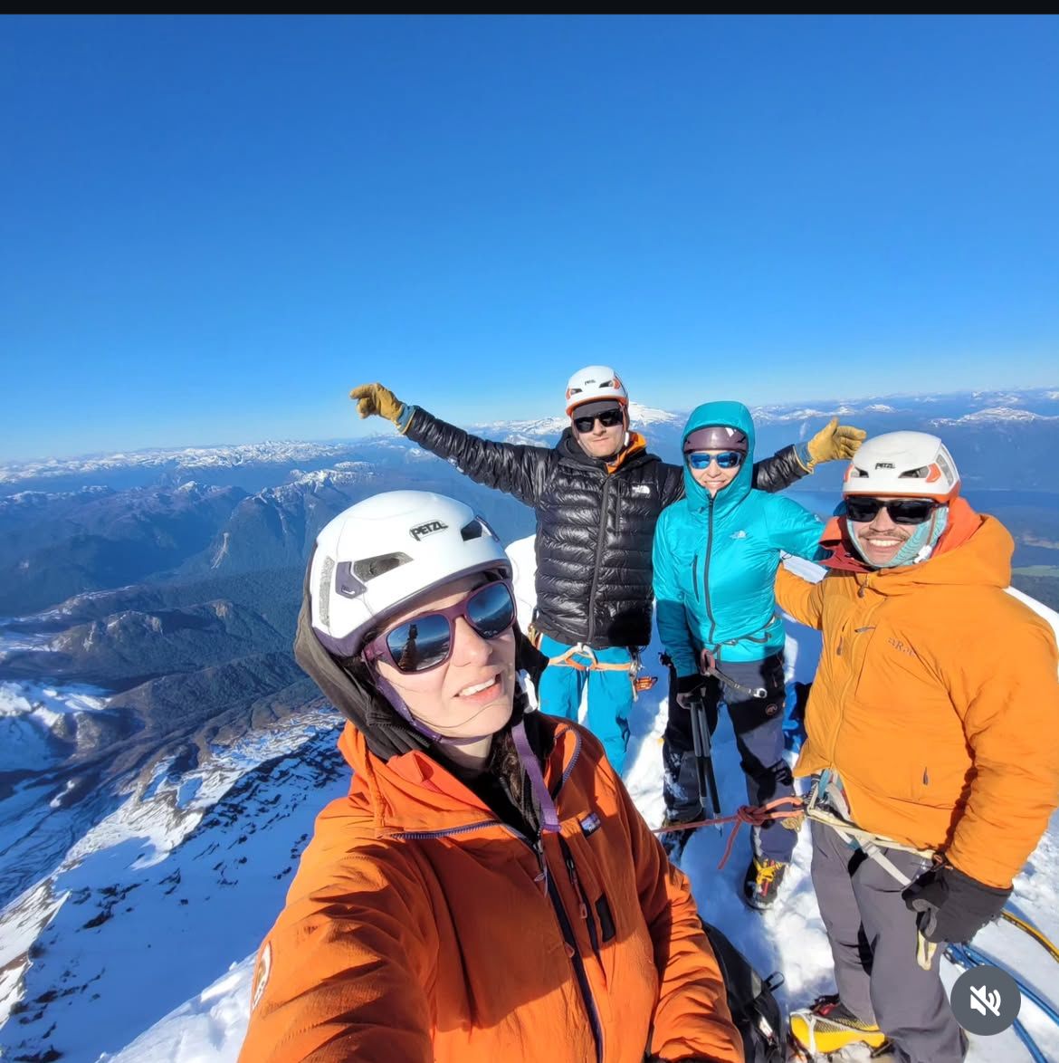 Arriba la foto de cumbre, abajo en alguna reunión de los 8 largos. Un volcán maravilloso esteticamente hablando, el bosque por el que se realiza la aproximación es muy bello tambien. Nos tocaron dias muy lindos en general salvo una pequeña tormenta que nos alcanzó de noche el mismo dia de cumbre, pero ya en tierra firme, esto nos permitió experimentar el nivel de cohesión de los cristales de hielo que forman estos pintorescos hongos de hielo ya que la nieve se "pegaba" en nuestra superficie (ropa, cara, mochila, etc). El encanto del sur en este maravilloso Volcán nos permitió compartirlo con 2 cordadas más que realizaron la cumbre el mismo dia. El ascenso fue escalando los 8 largos y el descenso fue por la pala de nieve que nos permitió desender rapidamente desde el largo 6 hasta la base. Entretenida salida con los amigos en tremendísimo volc